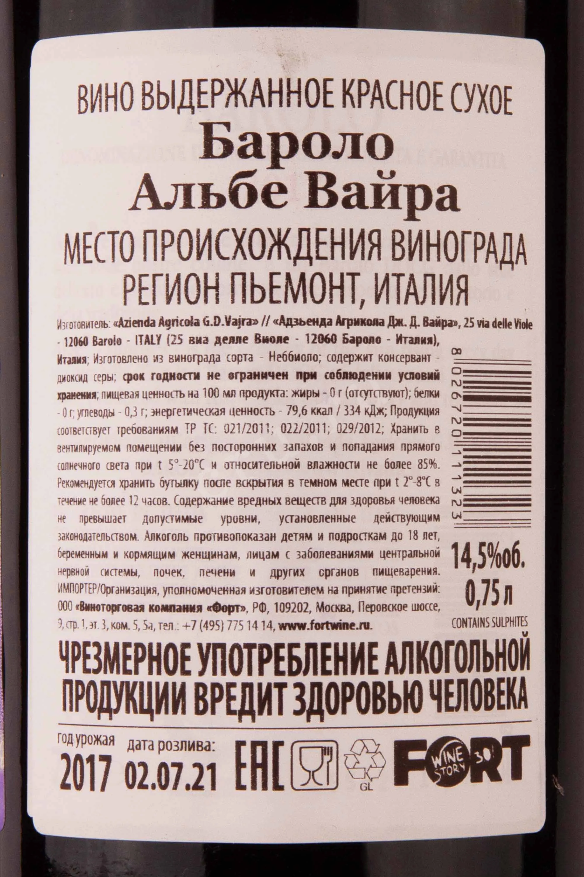 Красное сухое вино G.D. Vajra Albe Barolo 2017 год 0,75 л — моносортовой напиток из Пьемонта (Италия), который относится к классу защищенного географического указания (категория DOCG). Для его создания применяли спелые ягоды автохтона Неббиоло с молодых лоз трех участков региона. Урожай ручного сбора отсортировали и поместили в чаны для мацерации сроком 25 суток. Алкогольное и яблочно-молочное брожение выполнили в стальных баках, а затем вино налили в большие славонские дубовые баррики для долгой трехлетней выдержки. Многие специалисты уверены, что этот напиток может развиваться в стекле около пятнадцати лет.
