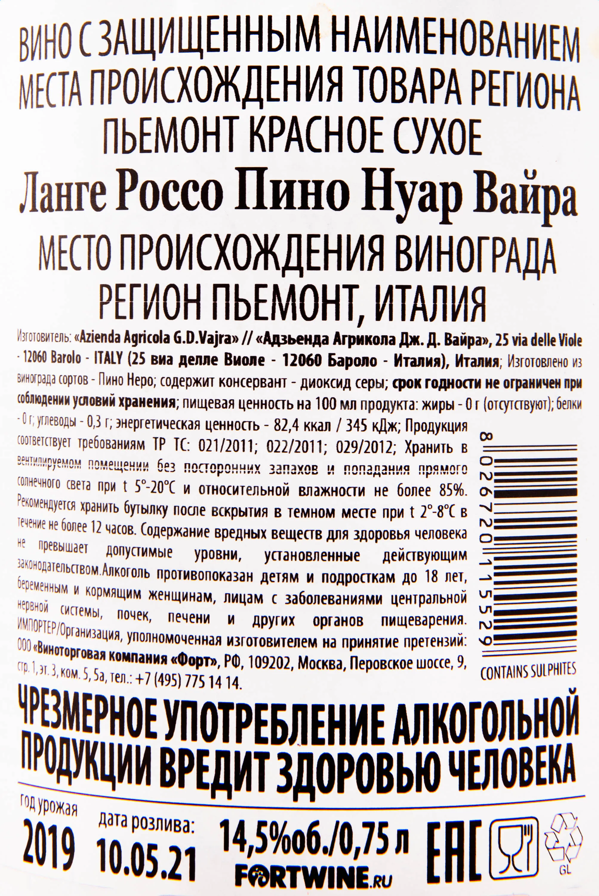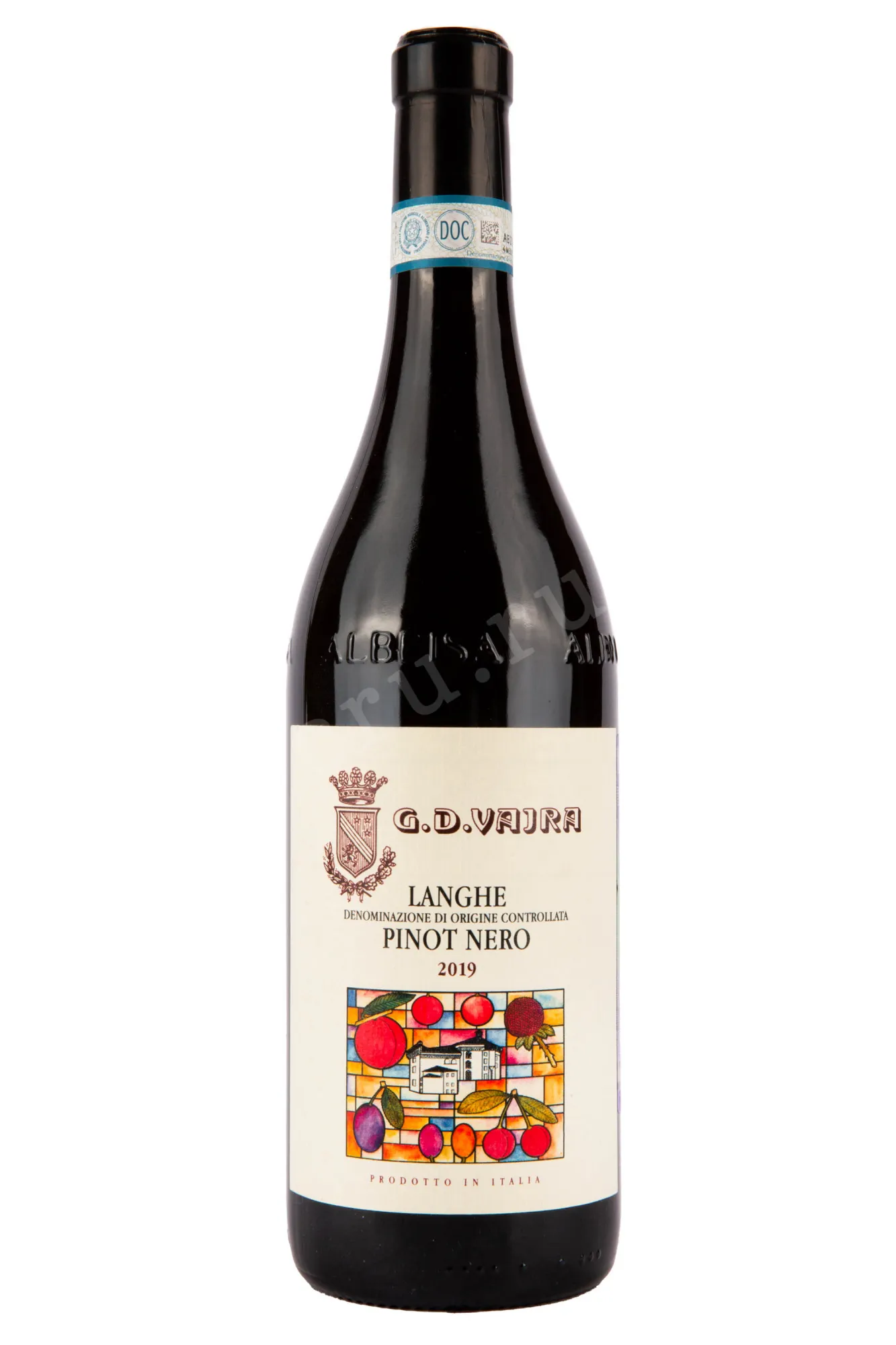 Красное сухое вино G.D. Vajra Langhe DOC Rosso Pinot Nero 2019 год 0,75 л на сто процентов состоит из отборного пьемонтского винограда, выращенного на участке выгодной южной экспозиции высотой не более 0,5 км над уровнем моря и собранного в сентябре. Здесь преобладают уникальные почвы с древними морскими окаменелостями, обогащающие вкусоароматику благородными минеральными оттенками. Урожай одинакового года долго ферментировали при 32 градусах Цельсия, после чего сусло прошло спонтанное сбраживание и двухлетнюю выдержку в двух типах резервуаров — стальных и дубовых. Можно хранить это вино в бутылке от семи до десяти лет, и весь этот срок его букет букет усложняться.
