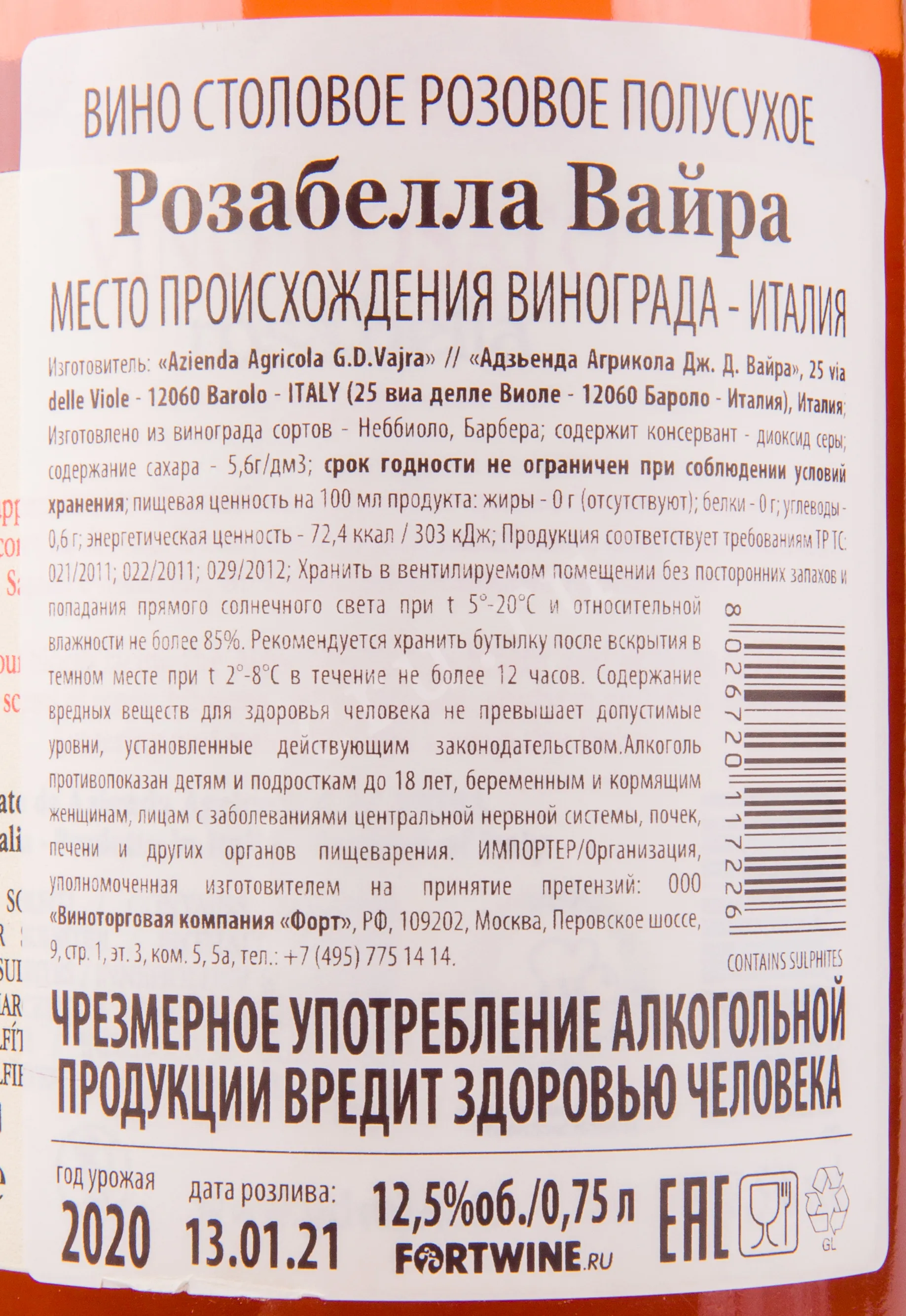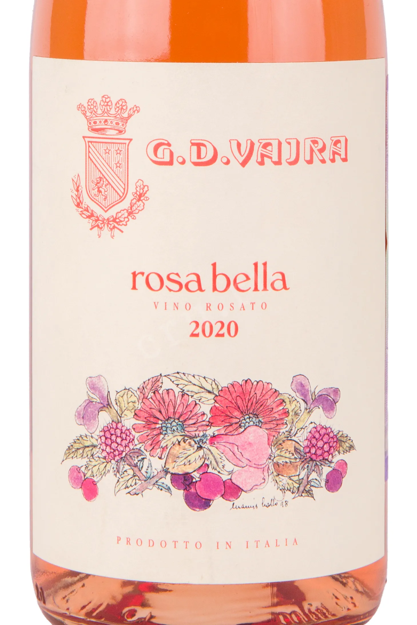 Розовое полусухое вино G.D. Vajra Rosabella Rosato 2020 год 0,75 л — сбалансированный бленд популярных сортов винограда Италии, в составе которого объединены автохтоны с плантаций Пьемонта. Изготовление напитка крепостью 12,5 процента осуществилось на современном заводе семейной компании. Обработке подвергся урожай одного года с минеральных участков, имеющих органический сертификат. Почти все процессы производства выполнили с использованием ручного труда: сбор, сортировку и ферментацию в контролируемом температурном диапазоне (не выше 24 градусов Цельсия). Перед розливом по бутылкам вино непродолжительное время вызревало в стальных резервуарах.