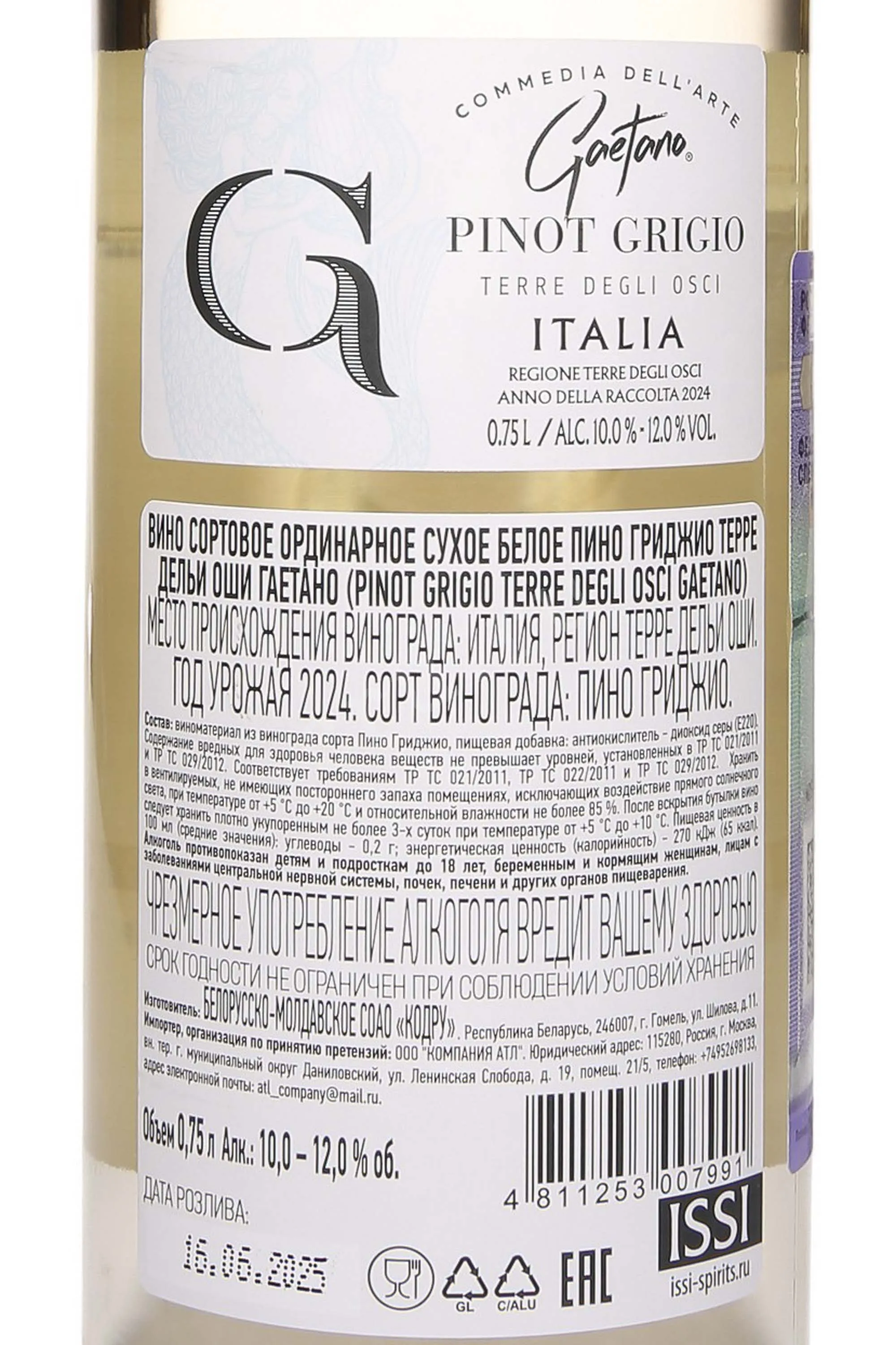 Белое сухое вино Gaetano Pinot Grigio Terre Degli Osci 2024 года 0,75 л произведено из винограда Пино Гриджио, выращенного в зоне Терре дельи Оши на юге Италии. Регион отличается мягким средиземноморским климатом. Лето было тёплым и солнечным, без резких перепадов температуры. Осень почти без осадков позволила собрать урожай в оптимальной зрелости. На винодельне виноград аккуратно прессовали. Брожение проходило при контролируемой низкой температуре, выдержка проводилась в стальных резервуарах без контакта с дубом. Производство вина осуществляется в Италии, розлив — на заводе в Белоруссии.