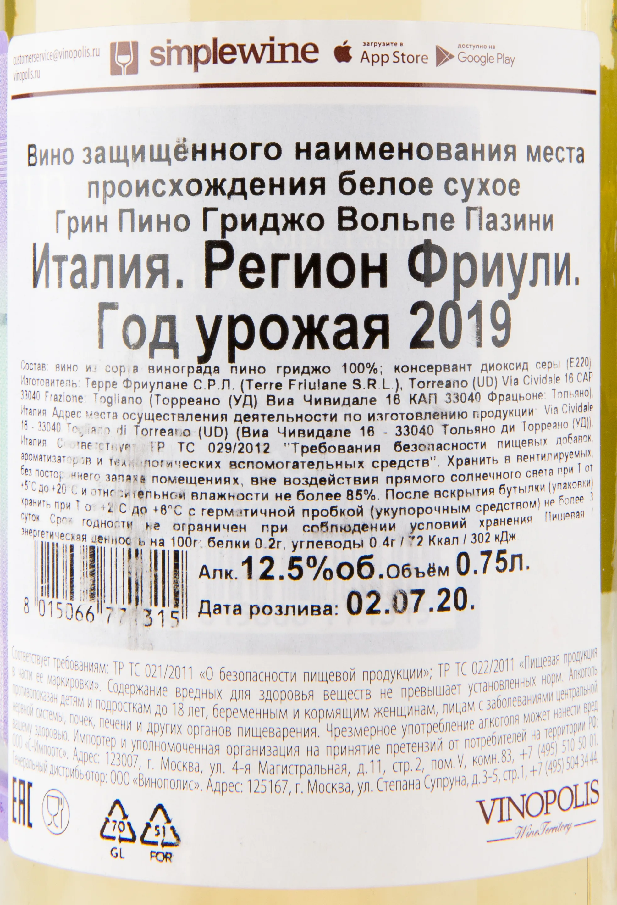 Вино Grin Pinot Grigio Volpe Pasini 2019 г. 0.75 l – это итальянский винтаж из урожая 2019 года, собранного с молодых лоз виноградника Фриули-Венеция-Джулия. Напиток крепостью 12.5% выдерживается непродолжительное время в емкостях из нержавеющей стали. Белое сухое вино было разлито по бутылкам в июле 2020 года и имеет потенциал хранения до 4-х лет.