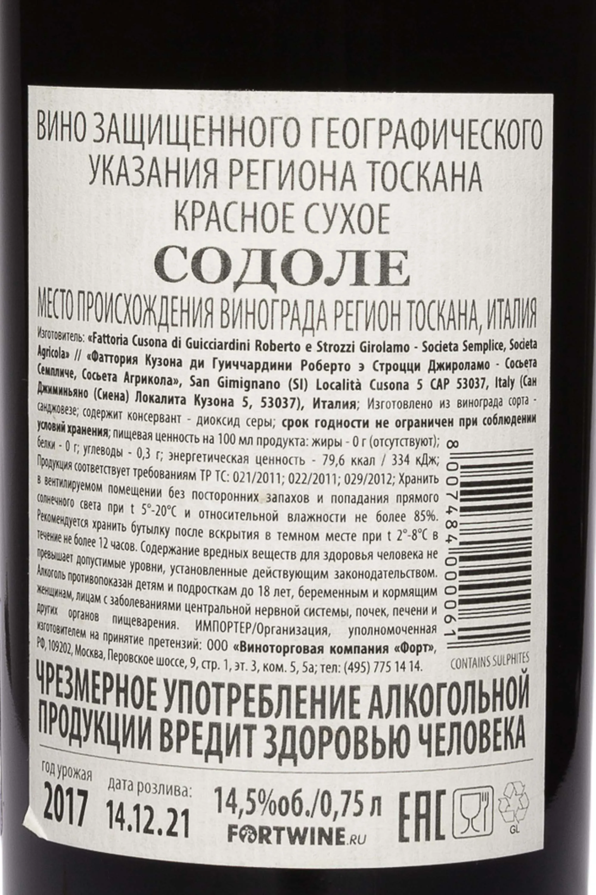 Красное сухое вино Guicciardini Strozzi Sodole 2017 год 0,75 л — качественный напиток, который выражает уникальные свойства терруара региона Тоскана. Этот вид производится семейным хозяйством с 1983 года в лучшие сезоны. В его основе — стопроцентный сорт Санджовезе с лоз низкой урожайности (до 60 тонн/га), прошедший мацерацию на кожице длительностью не более двенадцати дней и классическое брожение. Выдержка вина во французских дубовых бочках длилась до одного года. Специалисты считают, что для него характерен большой потенциал хранения — 10-15 лет.