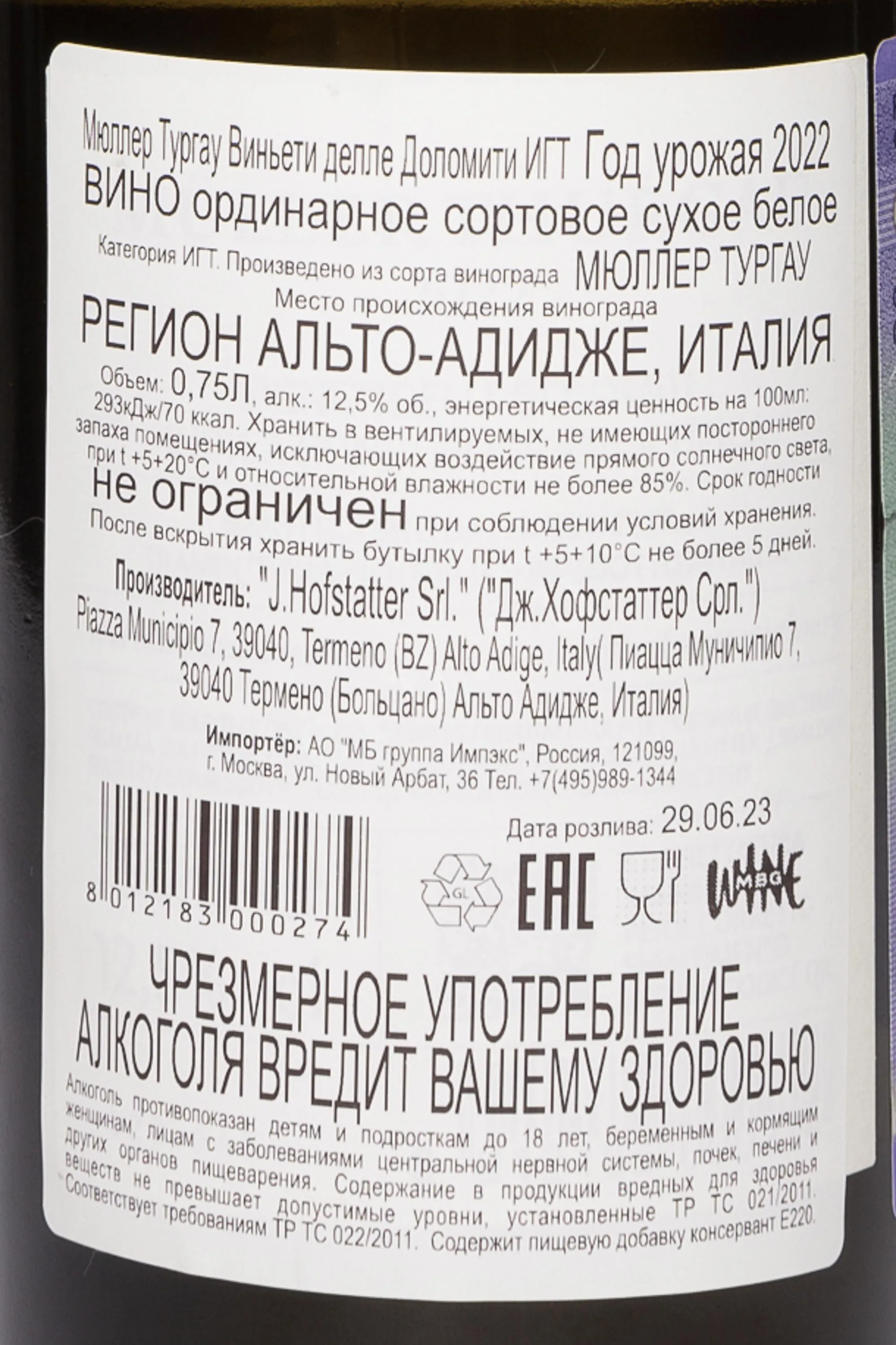 Белое сухое вино Hofstatter Muller Thurgau Vigneti delle Dolomiti IGT 0,75 л из Италии содержит высокогорный виноград с мергелевых дренированных почв области Трентино-Альто-Адидже, которые находятся на высоте более восьмисот метров над уровнем моря. Свежие ягоды, отсортированные после сбора на органических участках, доставили на винодельню и отправили под пневматический пресс. Ферментацию провели при постоянно поддерживаемой температуре, далее вино залили на несколько месяцев в стальные чаны для выдержки на дрожжевом осадке. С течением времени вино становится более сложным на вкус, что позволяет долго хранить в бутылках.