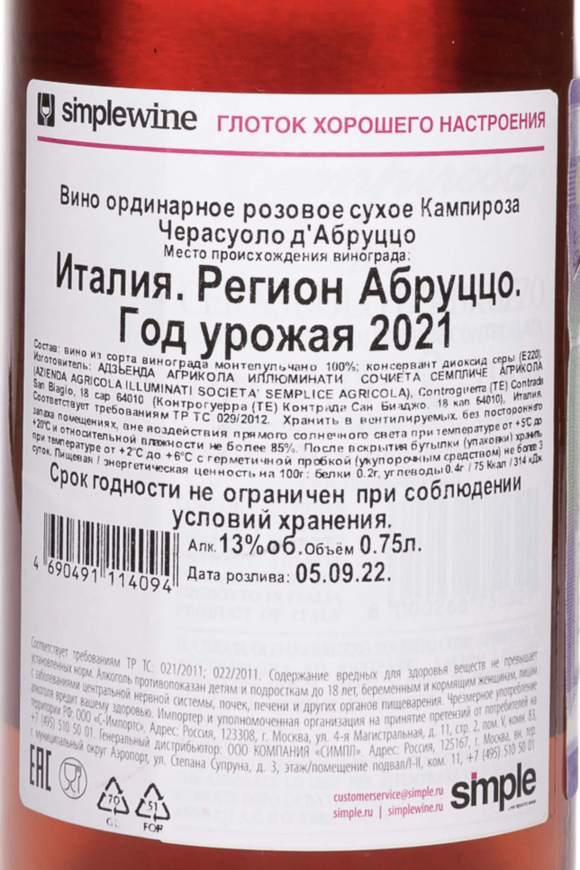 Вино Illuminati Montepulciano d`Abruzzo Campirosa Cerasuolo 0.75 л – розовая итальянская вариация сухого сорта, изготовленная в центре Аппенинского полуострова, в области Абруццо, которую также называют «зеленым сердцем Европы». В основе ее производства лежит розовый сорт винограда, выращиваемый исключительно на холмистой местности. Собранный урожай тщательно отбирают, отжимают и обрабатывают вместе с мякотью при низкой температуре. Весь процесс занимает около 15 часов. Низкие температуры и столь быстрая обработка позволяют винограду лучше раскрыть сортовой аромат. Ферментация осуществляется с применением селекционных дрожжей в нейтральных резервуарах при строгом температурном контроле. Непродолжительная выдержка производится в стальных чанах. Потенциал хранения вина составляет 4-5 лет.