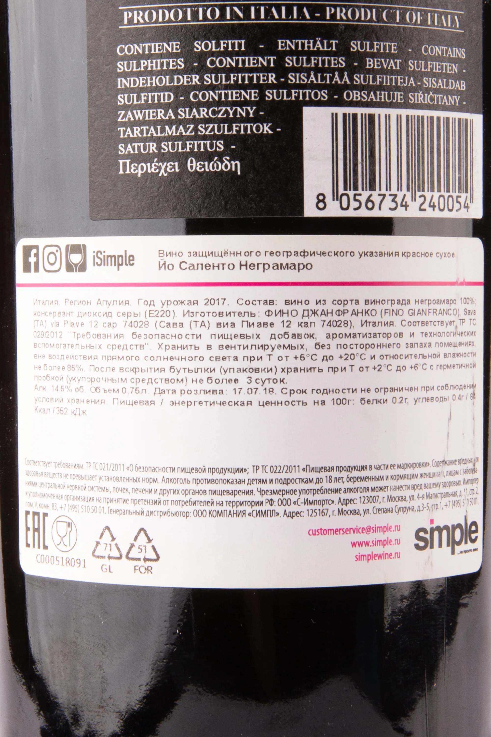 Вино Jo Salento Negroamaro 2018 г. 0.75 л - красное сухое итальянское вино из региона Апулия категории IGT. При возделывании лозы практикуют органические и биодинамические методы. Сбор урожая осуществляется вручную в середине сентября. Ягоды сортируют и подвергают мягкому прессованию. Мацерация производится в стальных чанах в течение 3 недель. Ферментация сусла осуществляется под температурным контролем. Выдержка винтажа длится 12 месяцев в дубовых бочках. После бутилирования напиток выдерживается еще 6 месяцев в бутылке.