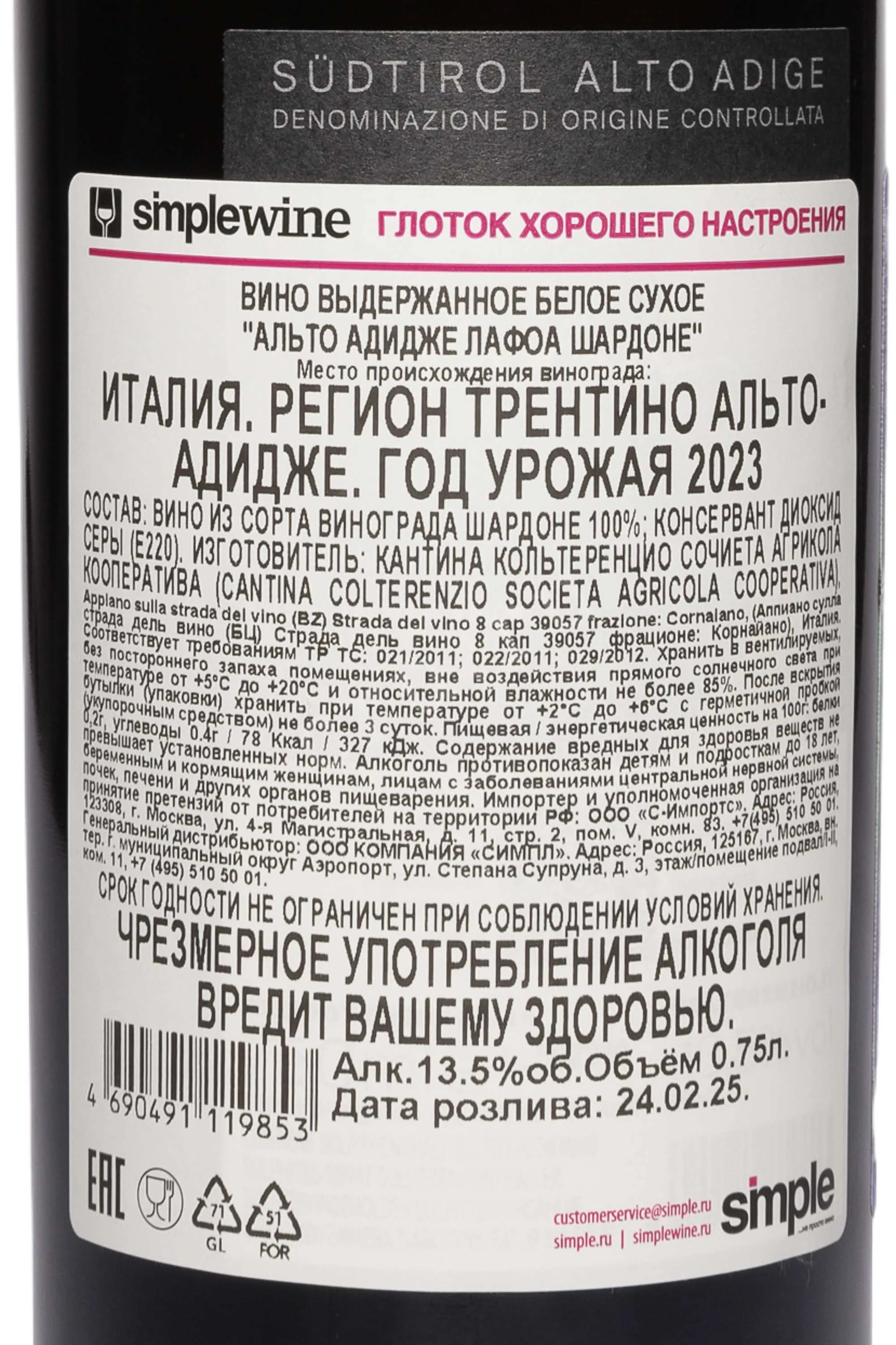 Белое сухое вино Lafoa Chardonnay Alto Adige DOC 2023 года 0,75 л — элегантное, с чистым прямым вкусом, характерным для прохладных долин Южного Тироля. Виноград выращивался на участке Лафоа, расположенном на горном склоне на высоте около 430 метров. Местный терруар с холодными ночами и тёплыми днями обеспечивает медленное созревание ягод и высокую естественную кислотность. Урожай 2023 года собрали в сентябре, когда ягоды набрали оптимальную сладость. Сусло после мягкого прессования разделили на две части: одна прошла ферментацию в стальных резервуарах, другая — в дубовых бочках Аллье и Тронсэ. Затем вино выдержали десять месяцев и ещё полгода — в бутылке. Лафоа Шардоне Альто Адидже ДОК 2023 выделяется не только балансом вкуса, но и яркой этикеткой, созданной студией Guardenti и вдохновлённой образом богини плодородия, который воплощен в скульптуре Guido Muss Mosna.