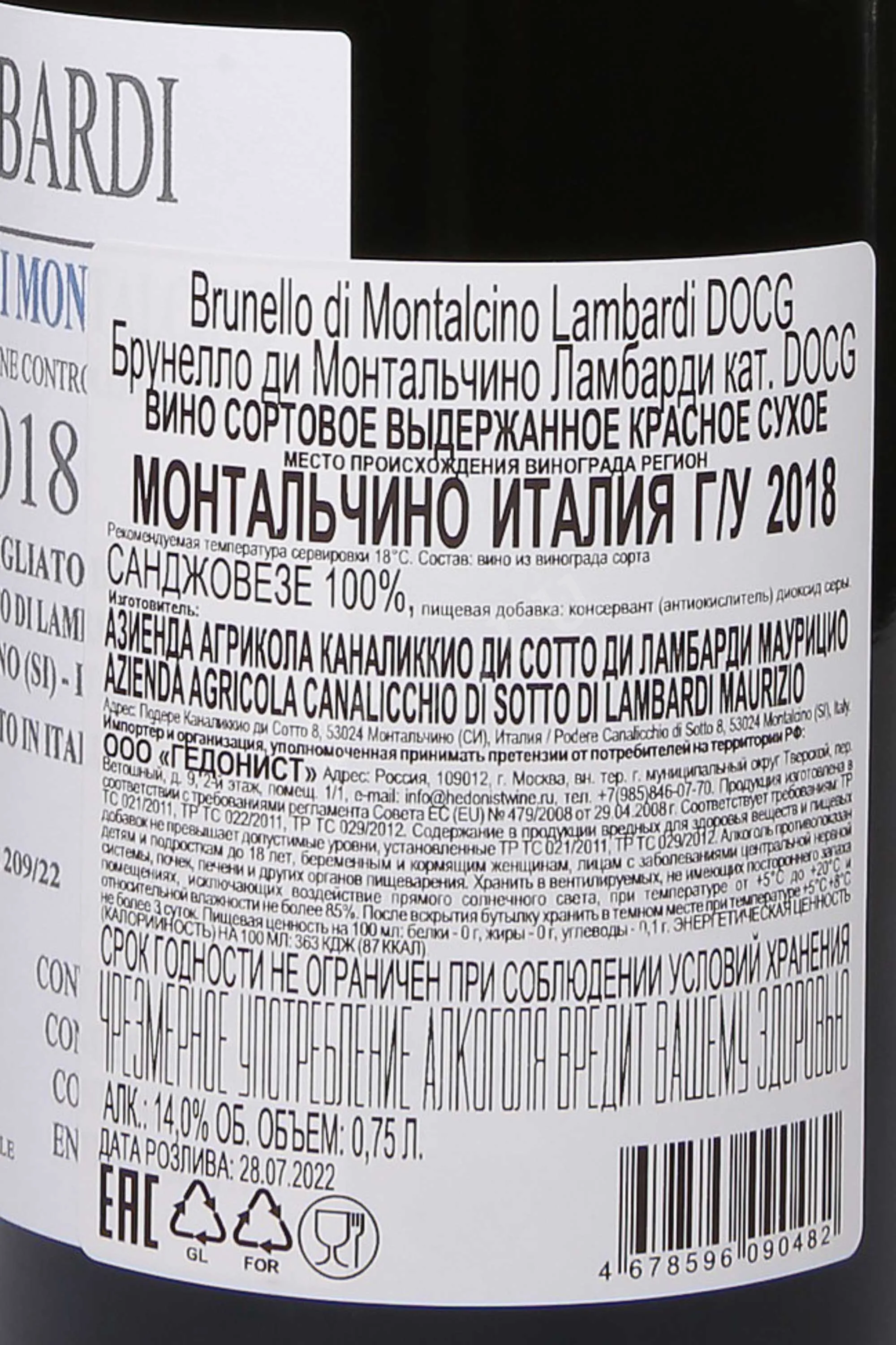 Красное сухое вино Lambardi Brunello di Montalcino DOCG 2018 года 0,75 л создано в классическом стиле региона Тоскана. Виноград выращен на холмах Монтальчино, где почвы богаты известняком и глиной, а мягкий климат с перепадом температур позволяет ягодам сохранять баланс сахаров и кислотности.2018 год был относительно прохладным и дождливым в начале сезона, но к осени установилась теплая погода, что позволило собрать качественный виноград с хорошей ароматикой. Его отделили от гребней и подвергли холодной мацерации. Ферментация проходила в стальных емкостях при температуре не выше 30 градусов, что сохранило чистоту сортового профиля. Трехлетняя выдержка протекала в больших бочках из славонского дуба, что обеспечило вину сложность и структуру. Далее оно 2 года дозревало в бутылках. Брунелло от Ламбарди отличается традиционным стилем и строгостью, в нем чувствуется глубокая связь с терруаром. Винтаж 2018 года получил 16,5 баллов из 20 от Джансис Робинсон, 90/100 от Falstaff Magazine и 92/100 от Джеймса Саклинга.