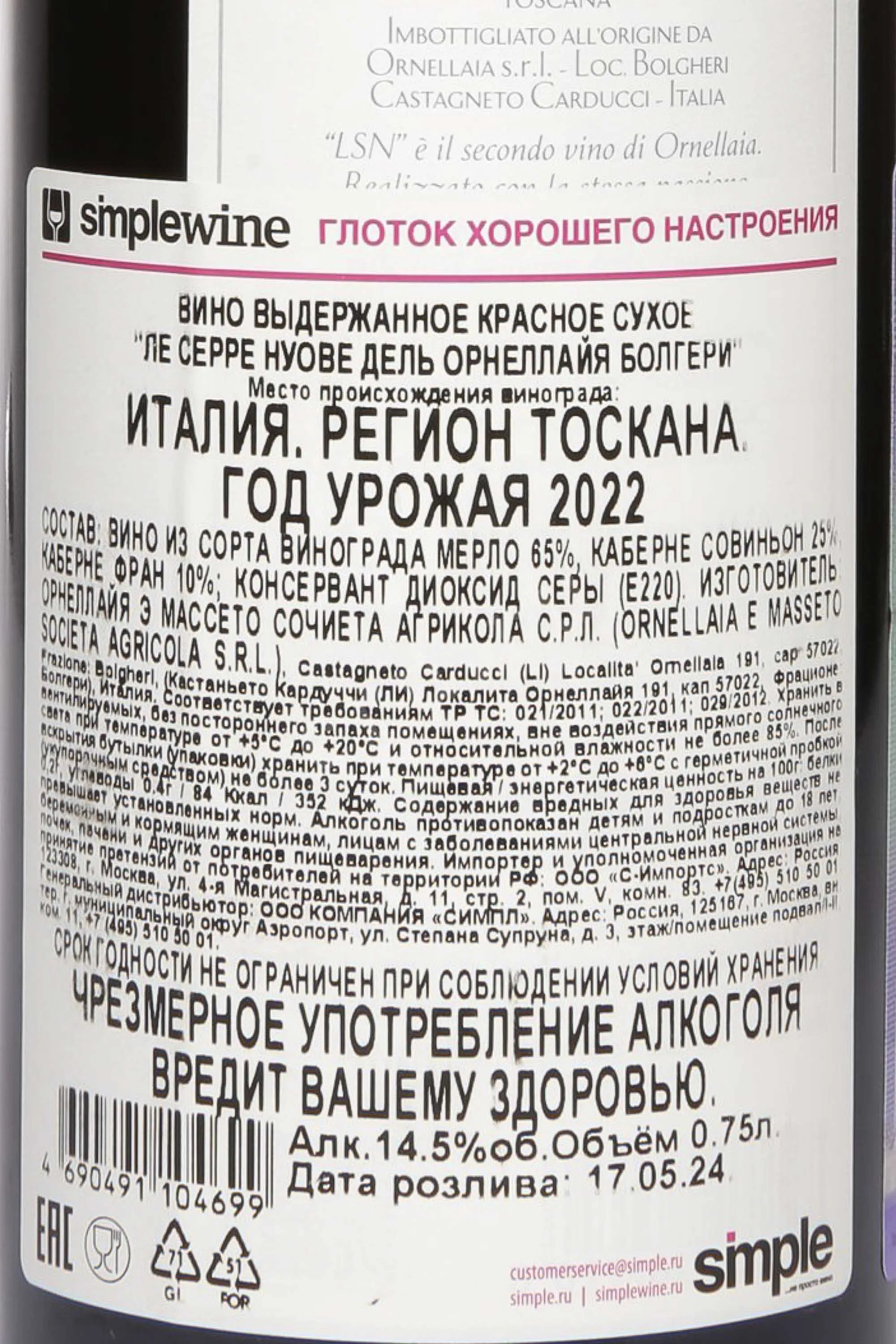 Красное сухое вино Ornellaia Le Serre Nuove Bolgheri Rosso DOC 2022 года 0,75 л создано в тосканском терруаре Болгери, где на климат влияют морское бриза, а виноградники разбиты на солнечных склонах. 2022 год оказался сложным для виноделов: весна была прохладной и без осадков, затем последовал долгий период жары и засухи, что снизило урожайность. Но летние дожди восстановили баланс, а прохладные ночи сентября обеспечили идеальное созревание ягод с насыщенной концентрацией сахара и танинов. Сбор винограда осуществлялся вручную в небольшие ящики, ягоды проходили строгую сортировку. Три сорта, сходящие в купаж, винифицировались отдельно. Также отдельно перерабатывалось сырье с каждого участка. Брожение протекало частично в стали, частично в бетоне при контролируемой температуре. Мацерация заняла около двух недель. Малолактическая ферментация начиналась в стали и завершалась в дубовых барриках (25% новые). В них же протекала выдержка 12 месяцев, затем был составлен ассамбляж. Вино провело в дубе еще 3 месяца, затем дозревало в бутылках. Винтаж 2022 года имеет потенциал 20 лет. Он получил 93/100 баллов от Wine Spectator («Незаурядное вино»), 94/100 от Falstaff Magazine («Восхитительное») и 95/100 от James Suckling («Неповторимое»).