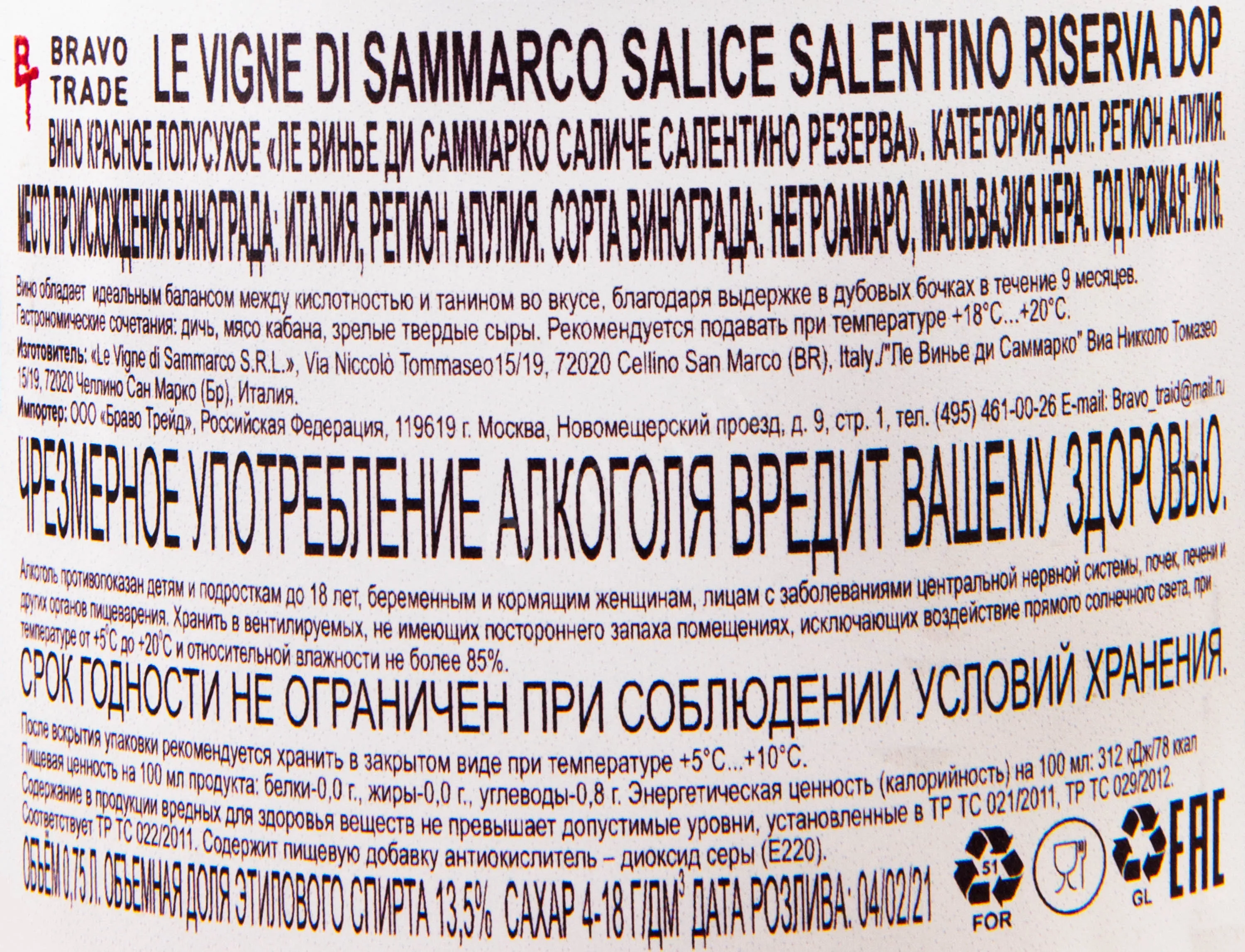 Красное полусухое вино Le Vigne di Sammarco Salice Salentino Riserva Rosso 0,75 л происходит из региона Апулия. Урожаи для изготовления напитка собирают в родовом поместье владельцев винодельни, расположенном в сельской местности Челлино-Сан-Марко. Напиток представлен купажом двух итальянских автохтонов, ягоды которых обладают яркой и концентрированной органолептикой. В погребе плоды очищают от стеблей и дробят, после чего сусло ферментируют при 24-25 °С вместе с кожицей на протяжении недели. До розлива спиртное хранится в стальных резервуарах.