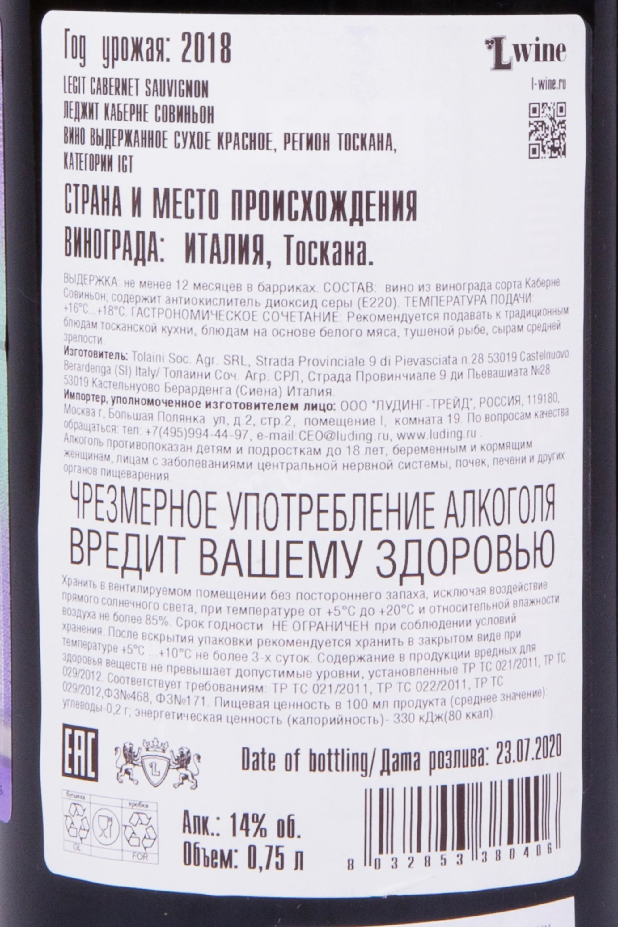 Вино Tolaini Legit Cabernet Sauvignon IGT 2018 0.75 l – это красный сухой итальянский алкоголь защищенного географического наименования, который производится из одного сорта винограда урожая 2018 года. После сбора и гребнеотделения ягоды сбраживают вместе с кожицей на протяжении одного месяца. Затем напиток созревает сначала не менее двух лет в барриках из альенского дуба, а после еще три года непосредственно в бутылках. Готовое вино имеет крепость 14% и обладает потенциалом к выдержке до 5 лет.