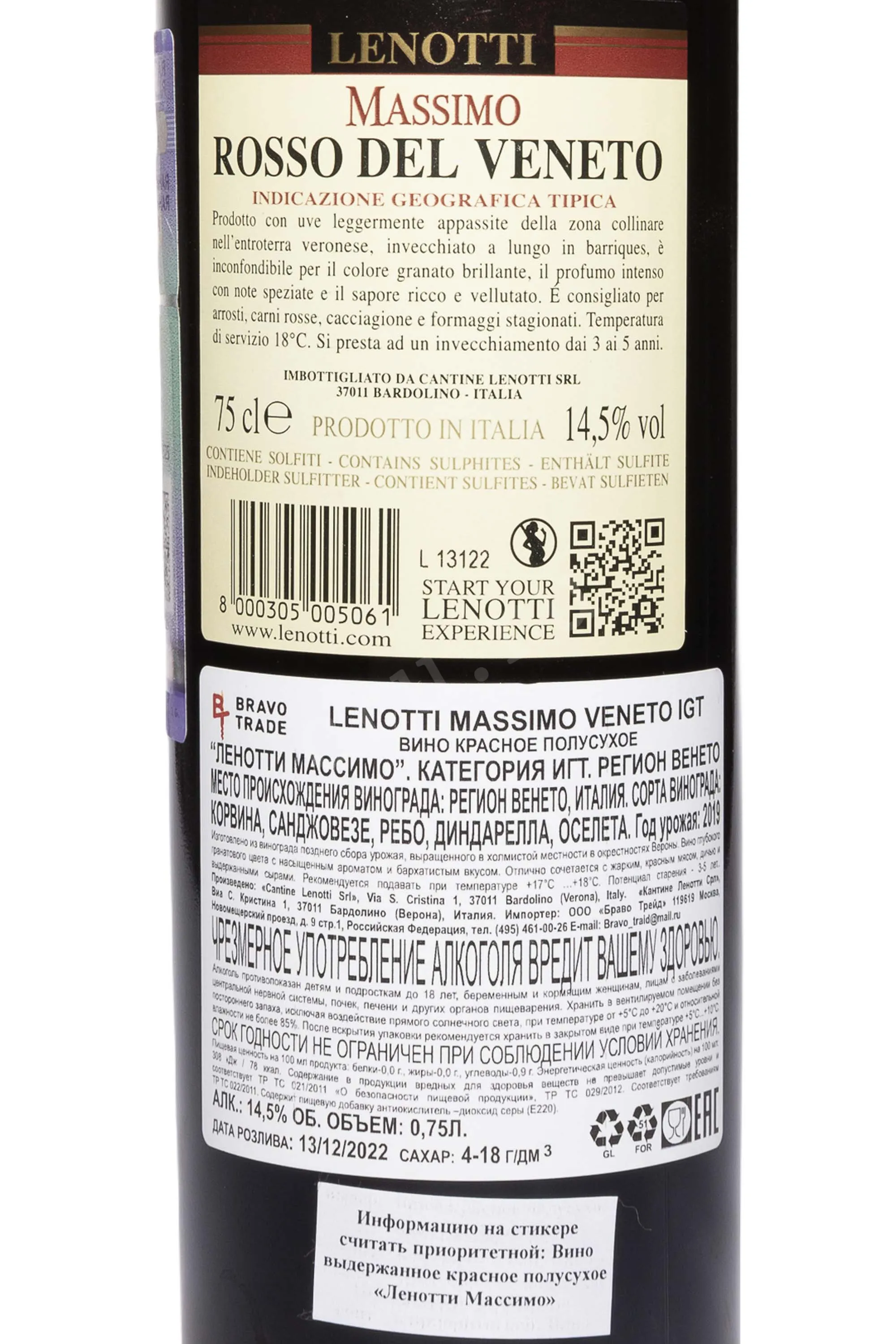 Красное полусухое вино Lenotti Massimo 0,75 л выпускается ограниченным тиражом. Оно изготавливается из классических североитальянских сортов винограда, в том числе и весьма древних. Сырье ненадолго оставляют в ящиках для просушки, затем мягко прессуют и ферментируют на протяжении недели при температуре 24-26 градусов. В завершение напиток созревает в дубовых бочках, часть которых представлена французскими барриками.