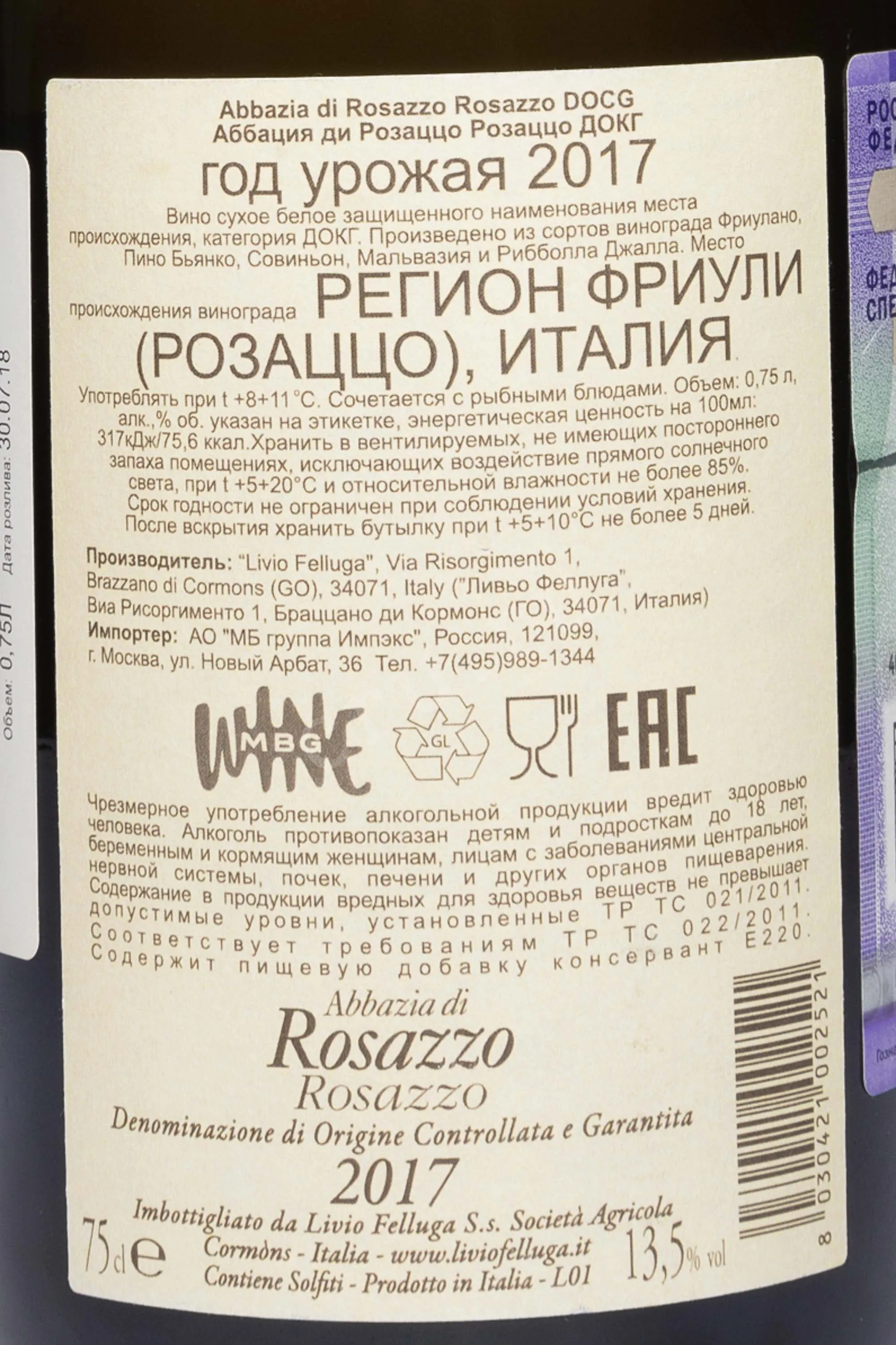 Вино Livio Felluga Abbazia di Rosazzo Colli Orientali del Friuli DOCG 2018 г. 0.75 л - белое сухое итальянское вино. Сбор винограда осуществляется вручную в первой половине сентября в 3 этапа. Ягоды аккуратно дестиблируют, после чего проводят холодную мацерацию и мягкое прессование. Далее вино декантируется и проходит ферментацию в ёмкостях из нержавеющей стали с дрожжами из Фриули. Через 3 дня напиток помещают в бочки, где оно проходит яблочно-молочную ферментацию. Выдерживается в дубовых бочках до июля, а после бутилируется.