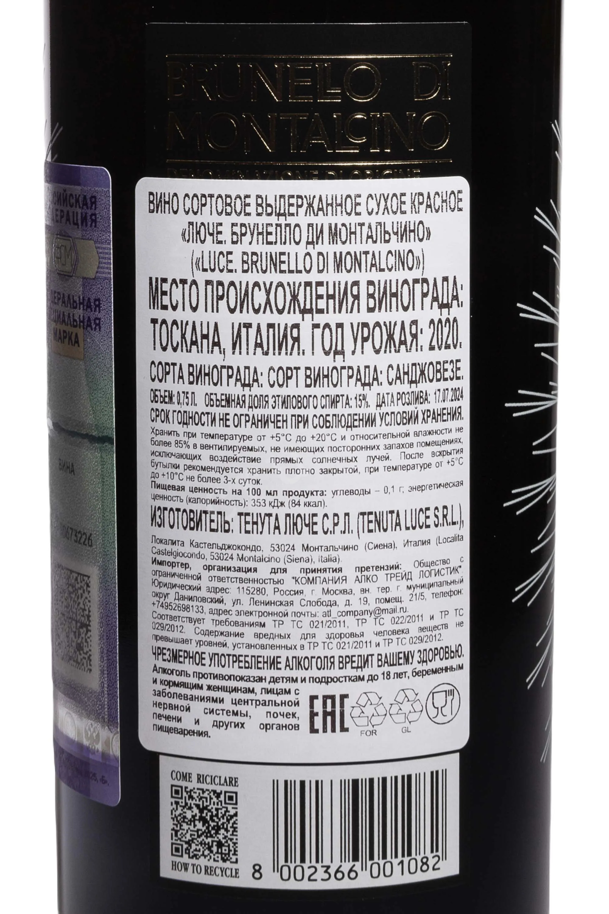 Красное сухое вино Luce Brunello Di Monatlcino DOCG 2020 года 0,75 л представляет классический стиль Брунелло с акцентом на чистоту сорта и выражение терруара. Виноград выращен в зоне Монтальчино, на высоком холме с мергелевыми почвами, которые обеспечивают хороший дренаж и равномерное созревание ягод. Урожай 2020 года считается удачным. Зима была мягкой и сухой, весна стабильной, а лето жарким. Дожди в конце августа снизили нагрузку на лозу. Суточные перепады температур перед сбором усилили ароматический профиль. Сбор прошёл в конце сентября, ягоды отличались здоровьем и зрелостью. Ферментация протекала с местными дрожжами при контролируемой температуре около 26 °C с последующим мягким прессованием. Выдержка длилась 24 месяца в бочках из славонского дуба. Винтаж 2020 года получил 93/100 балла от Wine Spectator («незаурядное вино»), 97/100 от Falstaff Magazine («отменное») и 17/20 от Jancis Robinson («изысканное»).