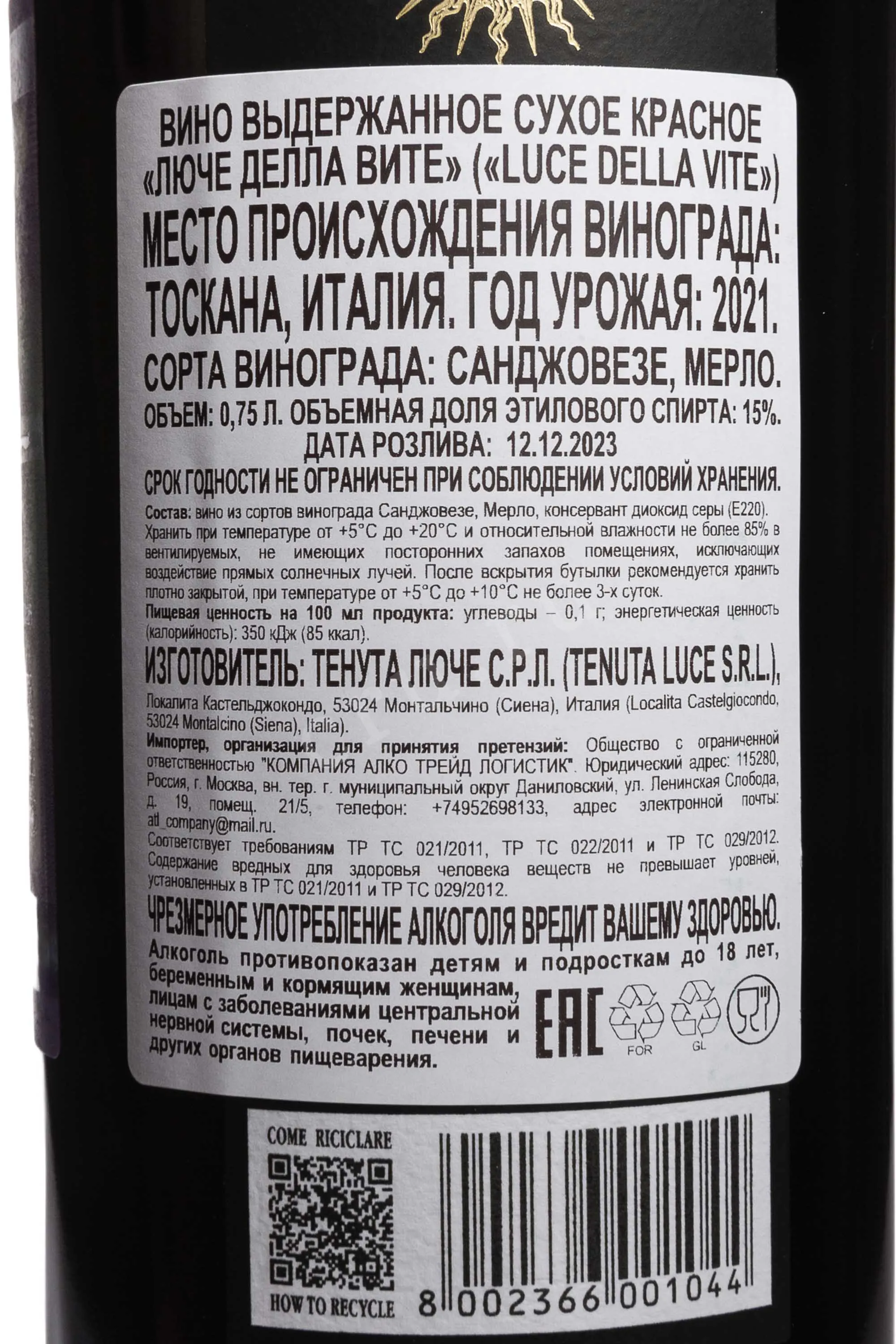 Красное сухое вино Luce della Vite IGT 2021 года 0,75 л — насыщенное и при этом живое, с современной интерпретацией стиля Монтальчино. Оно демонстрирует баланс концентрации, свежести и точной структуры. Виноград был выращен на холмистых участках юго-западной части апелласьона, где глинисто-галечные почвы и тёплый средиземноморский климат способствуют полному созреванию ягод. 2021 год отличался тёплой и стабильной погодой с прохладными ночами, что позволило ягодам сохранить кислотность и ароматическую чистоту. Вино производится из купажа Санджовезе и Мерло — для Монтальчино это было новаторским решением, ставшим визитной карточкой хозяйства Люче делла Вите. Ферментация проходила с контролем температуры, отдельно для каждого сорта. Выдержка длилась около 24 месяцев во французских дубовых барриках. Винтаж 2021 года был отмечен высокими оценками: 95/100 - Wine Spectator («исключительное вино»), 96/100 - James Suckling («неповторимое»), 93/100 - Vinous | 100 («особенное»). Потенциал хранения в бутылке — не менее 15 лет.