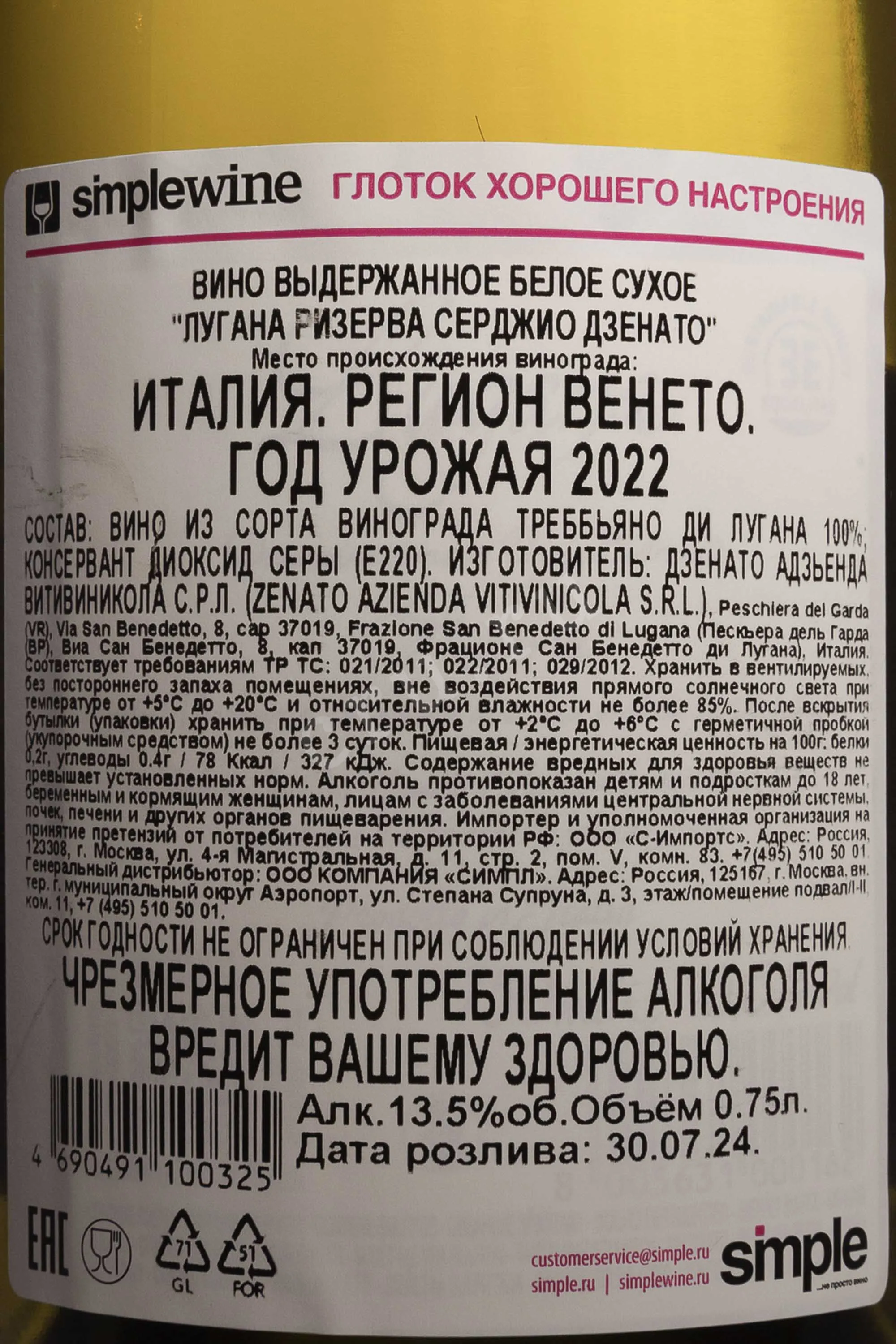 Вино Zenato Lugana Riserva DOC 2022 0.75 l – это полнотелый итальянский алкоголь защищенного наименования места происхождения, изготовленный из одного сорта винограда. Ягоды урожая 2021 года были собраны вручную на виноградниках в регионе Венето. Винификация протекает в больших дубовых барриках и стальных чанах. После напиток созревает полтора года без удаления осадка в деревянных барриках и стальных резервуарах, а затем еще полгода в бутылках. Готовое белое сухое вино имеет крепость 13.5% и потенциал к выдержке до 8 лет. Алкоголь был отмечен серебряной медалью на дегустационном конкурсе в Германии.