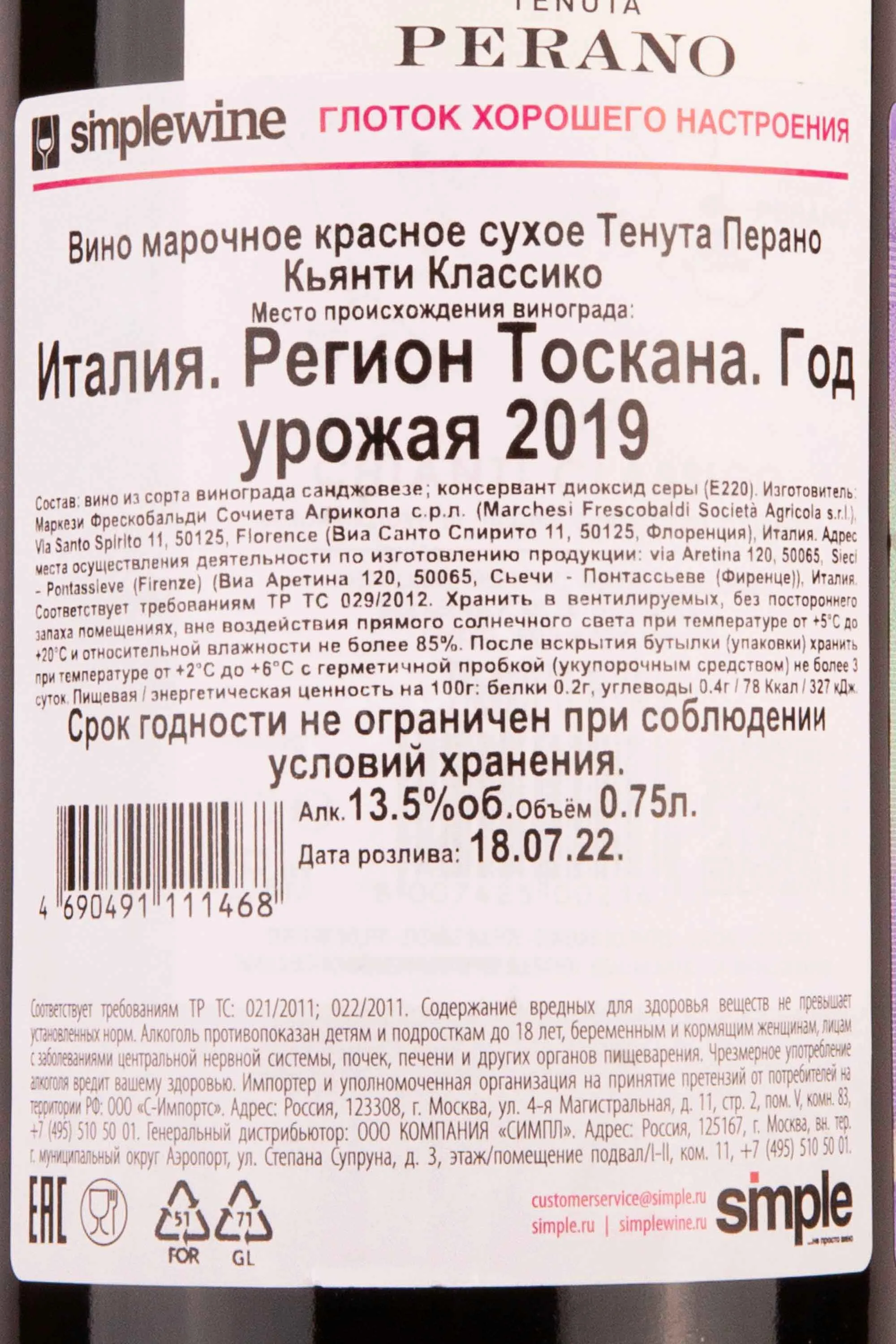 Красное сухое вино Frescobaldi Tenuta Perano Chianti Classico 2019 год 0,75 л контролируется по месту происхождения: зоной его производства и сбора винограда стала знаменитая область Кьянти в Тоскане. Напиток произвели из стопроцентных ягод Санджовезе с участков с холмистым рельефом, которые возвышаются над уровнем моря на 500 метров. Традиционная процедура винификации подготовленного сусла протекала в нейтральной таре и дубовых бочонках. Бутилирование провели после двух лет выдержки высококлассного вина в итальянском дубе. Считается, что данная вариация способна развивать вкусоароматику на протяжении пяти-восьми лет, следующих за датой розлива (18 июля 2022 года).