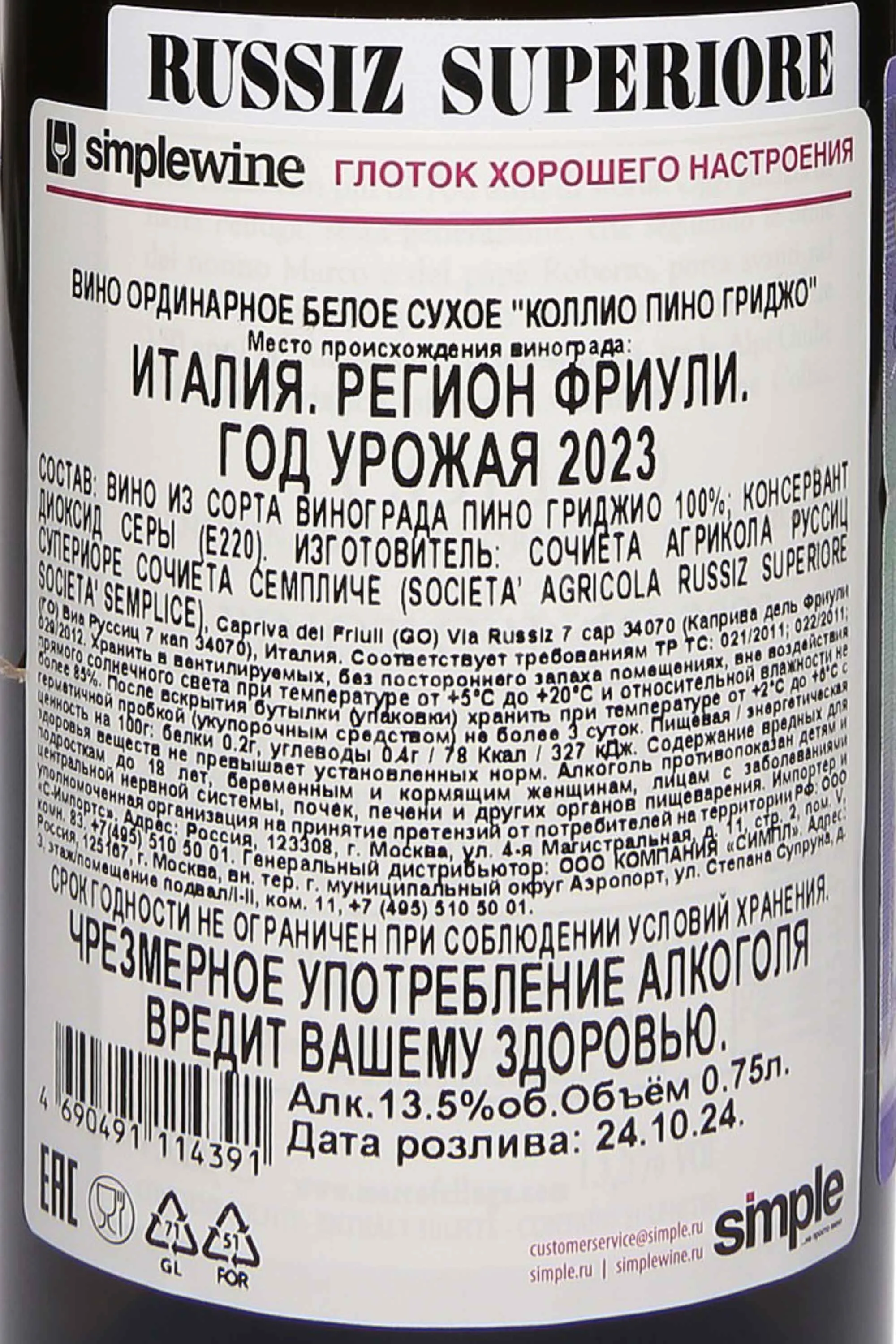 Marco Felluga Collio Russiz Superiore Pinot Grigio 2023 0.75 л купить - Итальянское вино Марко Фелуга Коллио Руссиц Супериоре Фриули Пино Гриджо цена в магазинег. Москва, ул. Профсоюзная, д. 16/1010:00-22:00 Ежедневно+7 (495) 920-20-02info@cru.ru