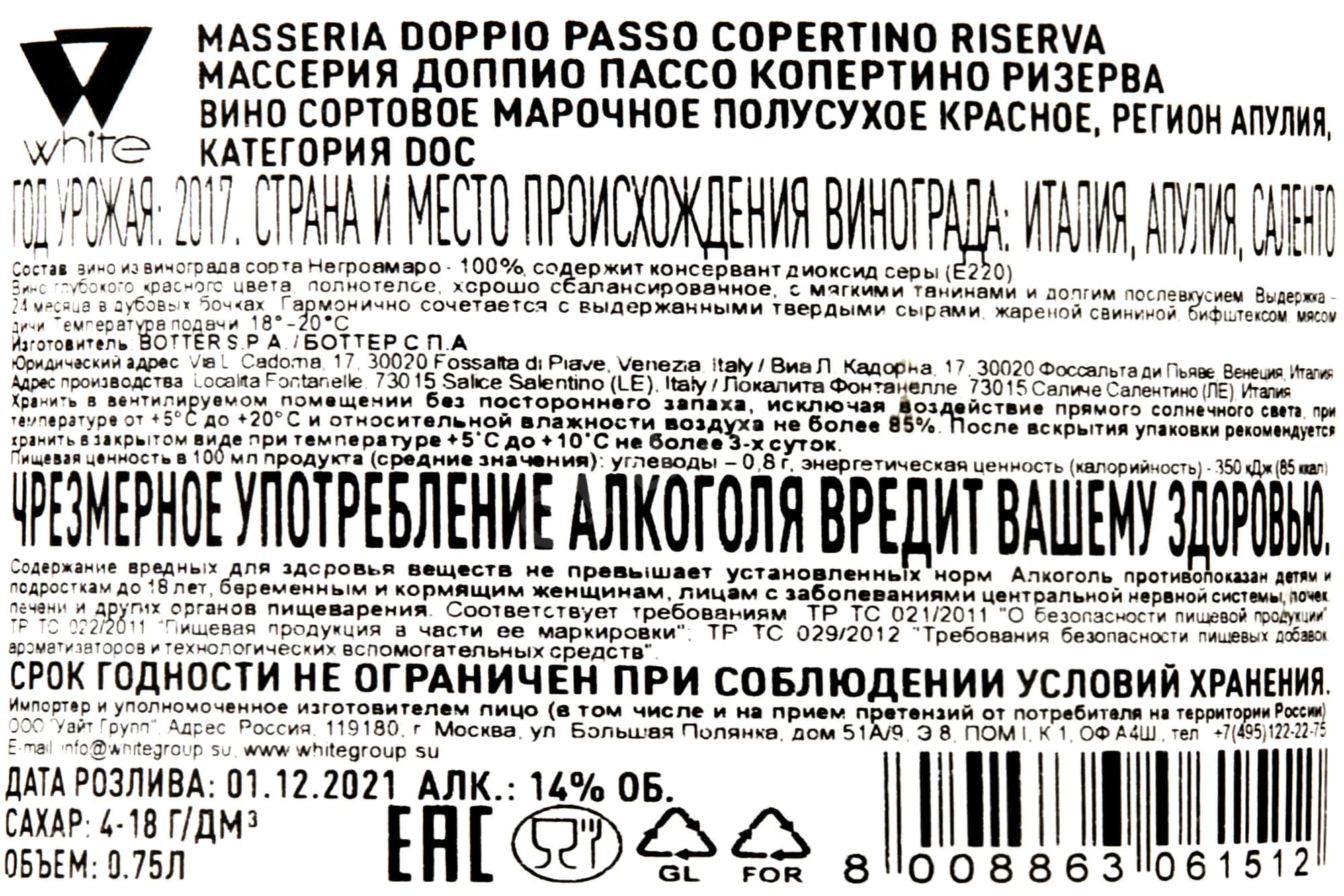 Masseria Doppio Passo Copertino Riserva 2017 0.75 л купить - Итальянское вино Массерия Доппио Пассо Копертино Ризерва цена в магазине г. Москва, ул. Профсоюзная, д. 16/10 10:00-22:00 Ежедневно +7 (495) 920-20-02 info@cru.ru