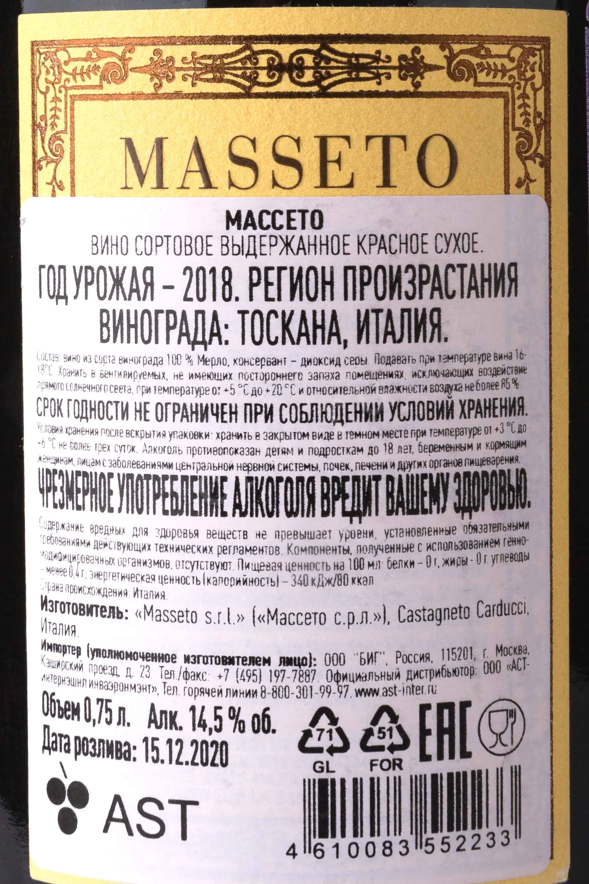 Красное сухое вино Masseto Ornellaia 2018 года 0,75 л — невероятно элегантное, благородное и изысканное, с многогранным букетом и идеальным балансом всех вкусовых оттенков. Роскошный образец моносортового Мерло от знаменитого тосканского хозяйства Массето из урожая 2018 года получил самые высокие оценки от критиков. Его назвали сенсационным, благодаря яркому и чистому выражению сортовых характеристик. Это одно из лучших Мерло в мире с глубоко индивидуальным характером. Винтаж удостоился 96 баллов от Wine Spectator («Исключительный»), 97 баллов от Роберта Паркера («Выдающийся») и 98 баллов от Джеймса Саклинга («Неповторимый»). Виноград собирали вручную только на одном особом винограднике с несколькими типами почв и разными экспозициями. Сбор проходил 3 недели с конца лета до начала осени, в общей сложности получилось 7 разных партий сырья. Каждая из них винифицировалась отдельно. Дважды проводилась сортировка ягод (после доставки на винодельню и после гребнеотделения). Ферментация протекала в стальных и деревянных емкостях, проводилась малолактика во французском дубе 12 месяцев. Далее был составлен купаж из всех партий, который выдерживали 24 месяца во французских барриках. После розлива в бутылки вино дозревало еще один год.
