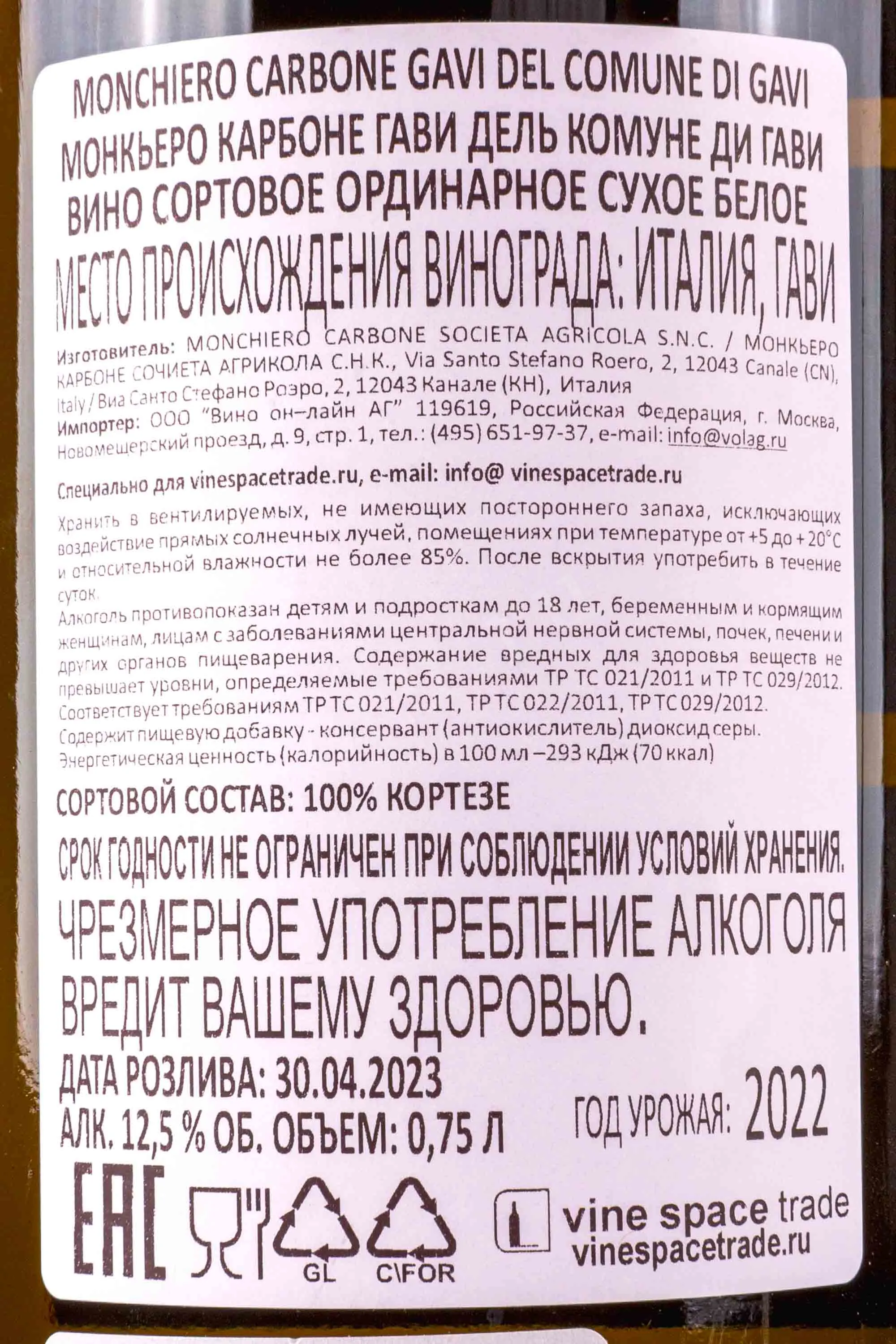 Белое сухое вино Monchiero Carbone Gavi del comune di Gavi 2022 г. 0,75 л отражает особенности юго-восточной части Пьемонта, где сорт Cortese даёт свежие минеральные напитки. Виноградники расположены на холмах с глинисто-известковыми почвами. Здесь умеренный климат с прохладными ночами. Эти условия помогают ягодам сохранять кислотность и формировать чистый характер. Урожай снимали с лоз вручную. Ягоды мягко прессовали, а отжатый сок отправили бродить при низкой температуре. Далее последовал этап созревания на осадке в стальных резервуарах.