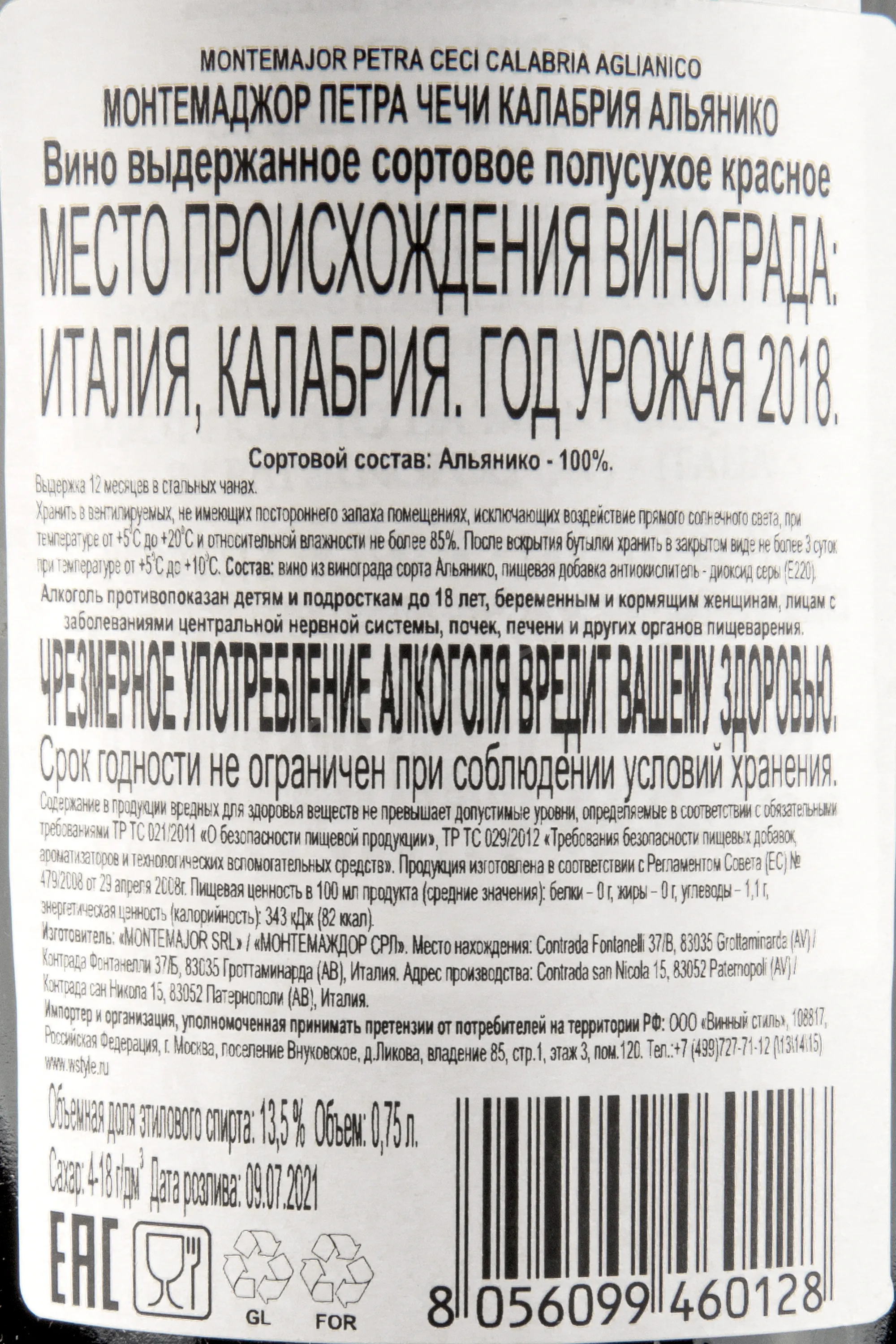 Montemajor Petra Ceci Calabria Aglianico 2018 0.75 л купить - Итальянское вино Монтемаджор Петра Чечи Калабрия Альянико цена в магазине г. Москва, ул. Профсоюзная, д. 16/10 10:00-22:00 Ежедневно +7 (495) 920-20-02 info@cru.ru
