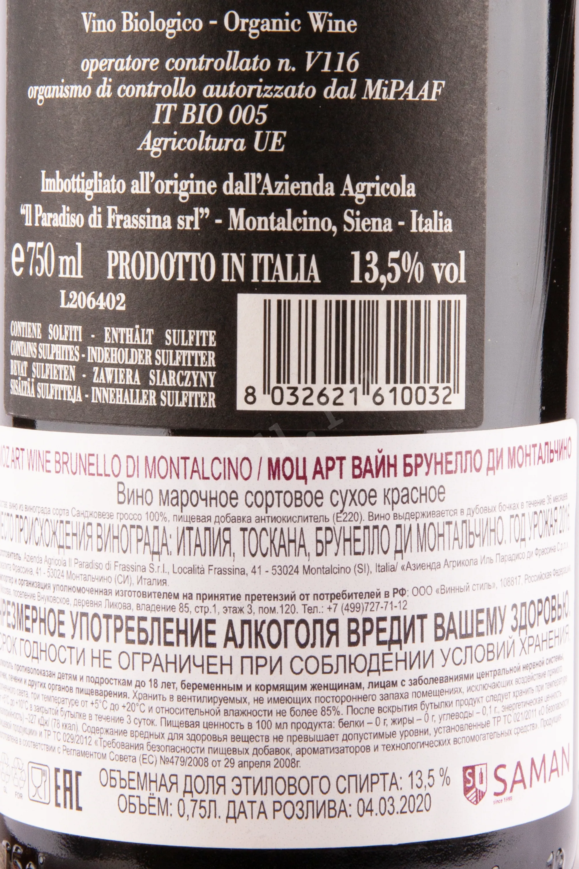 Красное сухое вино Moz Art Brunello di Montalcino 0,75 л относится к классу итальянских напитков защищенного географического наименования и маркируется аббревиатурой DOCG. Виноград для него собрали вручную близ местечка Монтальчино в регионе Тоскана и подвергли ферментации в нейтральных металлических емкостях, а также выдержке во французских дубовых бочках сроком от 36 месяцев. Крепость вина составляет 13,5%.
