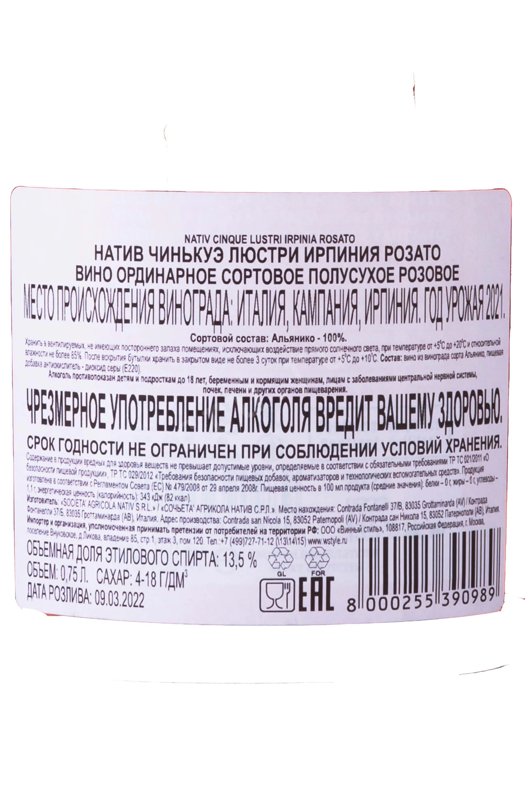 Nativ Chinkue Lyustri Irpiniya Rozato 2021 0.75 л купить - Итальянское вино Вино Натив Чинькуэ Люстри Ирпиния Розато цена в магазинег. Москва, ул. Профсоюзная, д. 16/1010:00-22:00 Ежедневно+7 (495) 920-20-02info@cru.ru