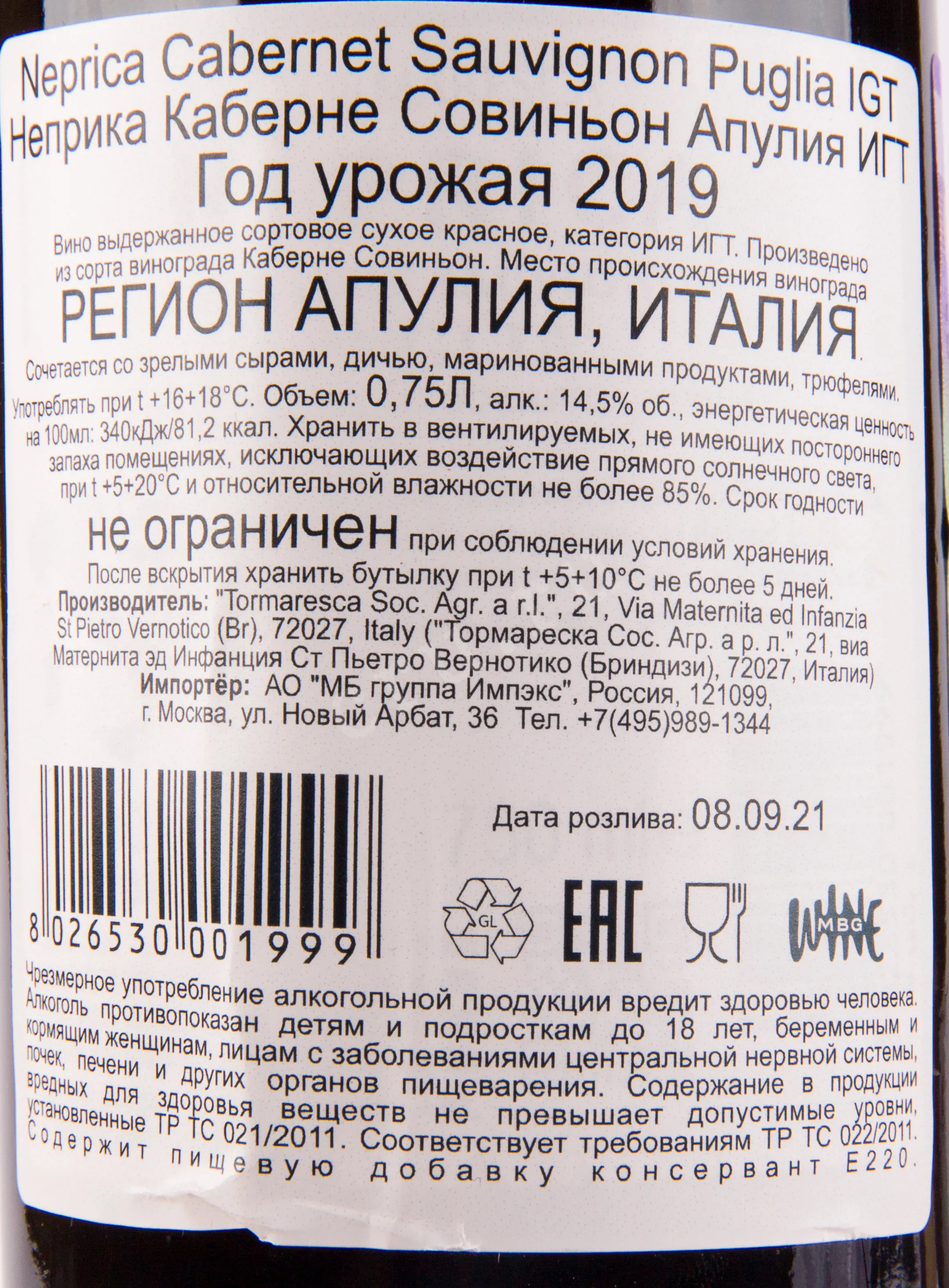 Вино Neprica Cabernet Sauvignon Puglia 2019 г. 0.75 l – это итальянский алкоголь от апулийской винодельни, созданный из зрелого винограда урожая одного года. Ферментация и мацерация производились в резервуарах из нержавеющей стали при контролируемой температуре не больше 28 °С в течение 10 дней. Красное сухое вино крепостью 14.5% выдерживалось в емкостях из нержавеющей стали 8 месяцев и после еще 4 месяца в бутылках.