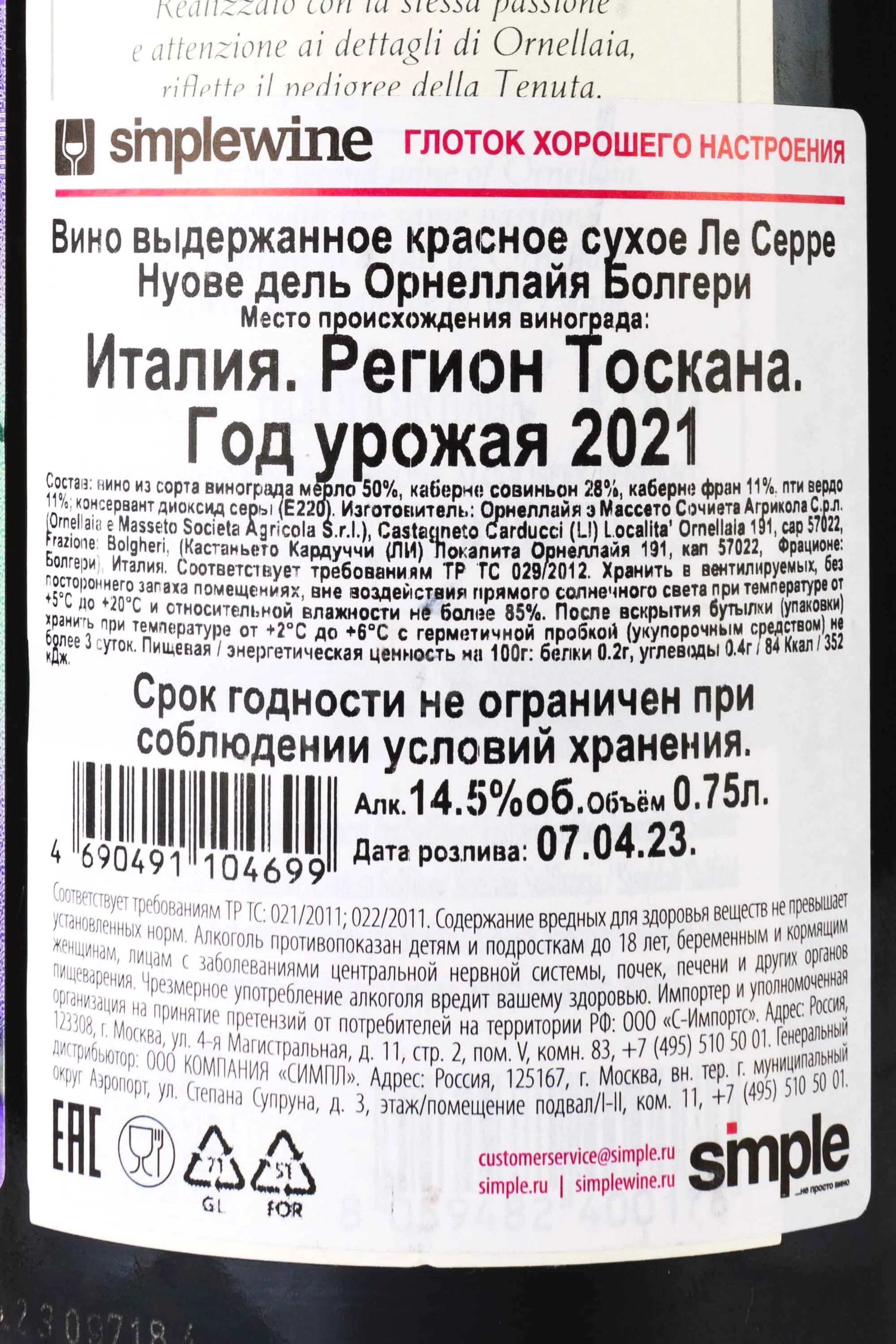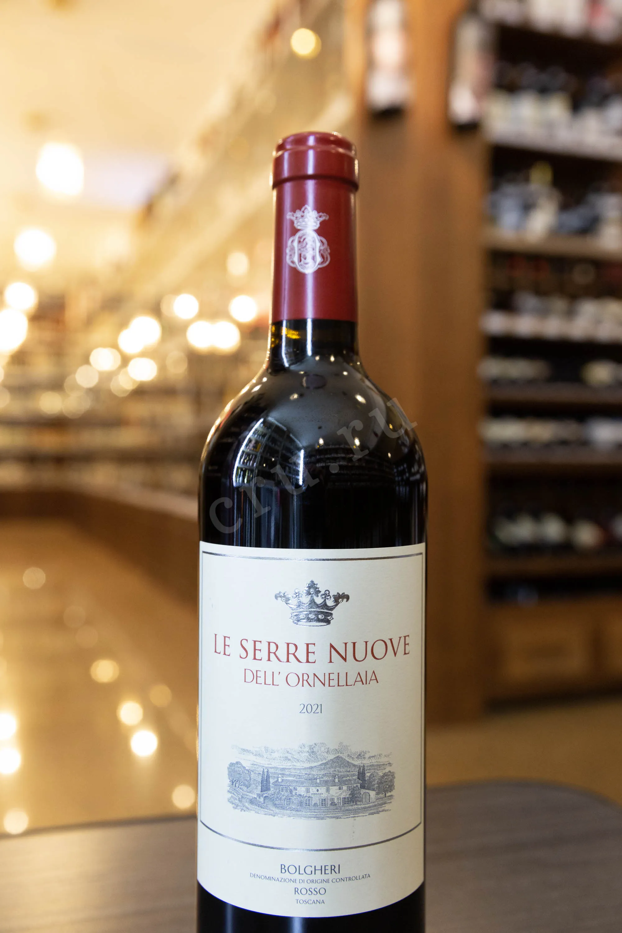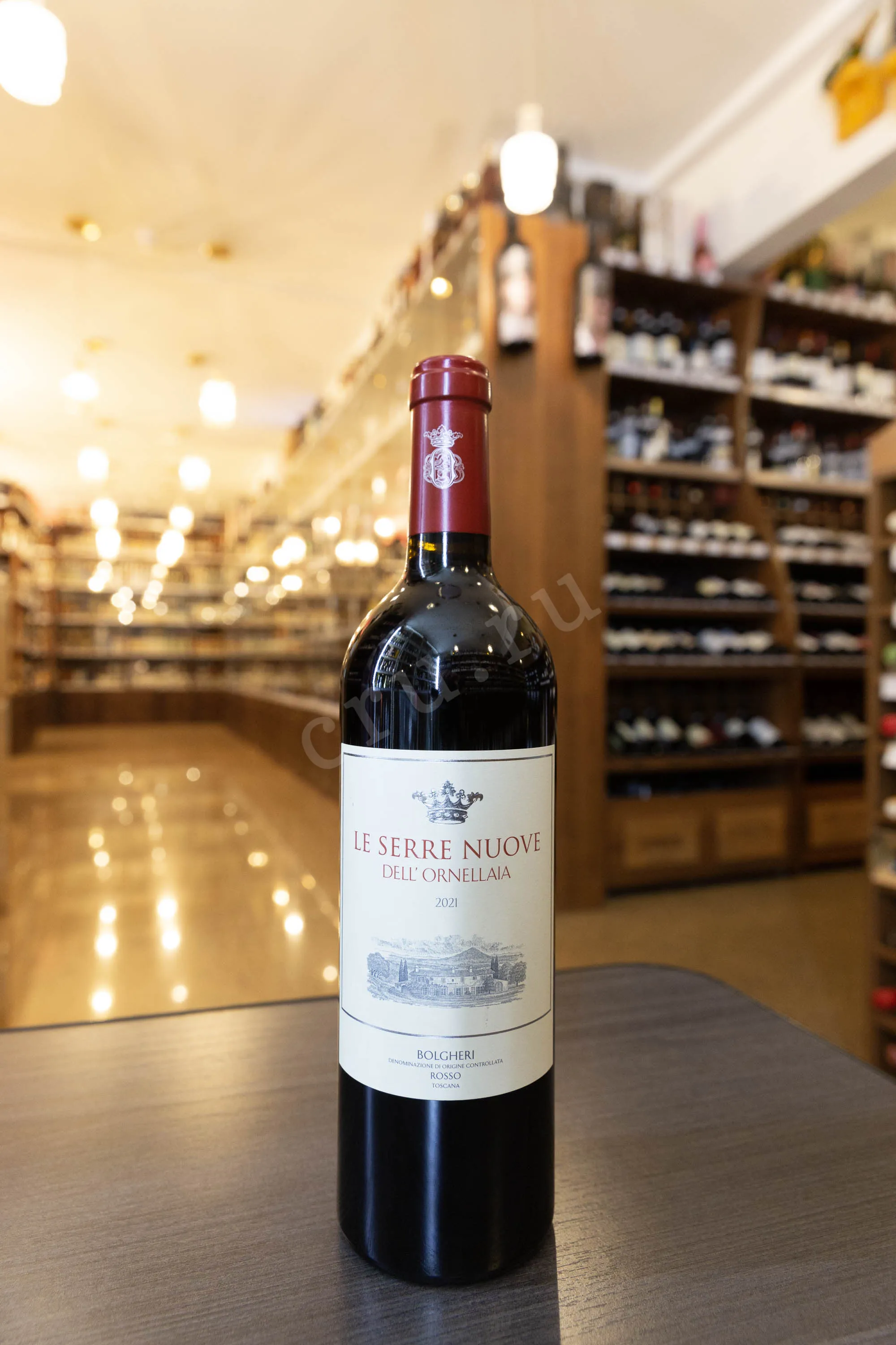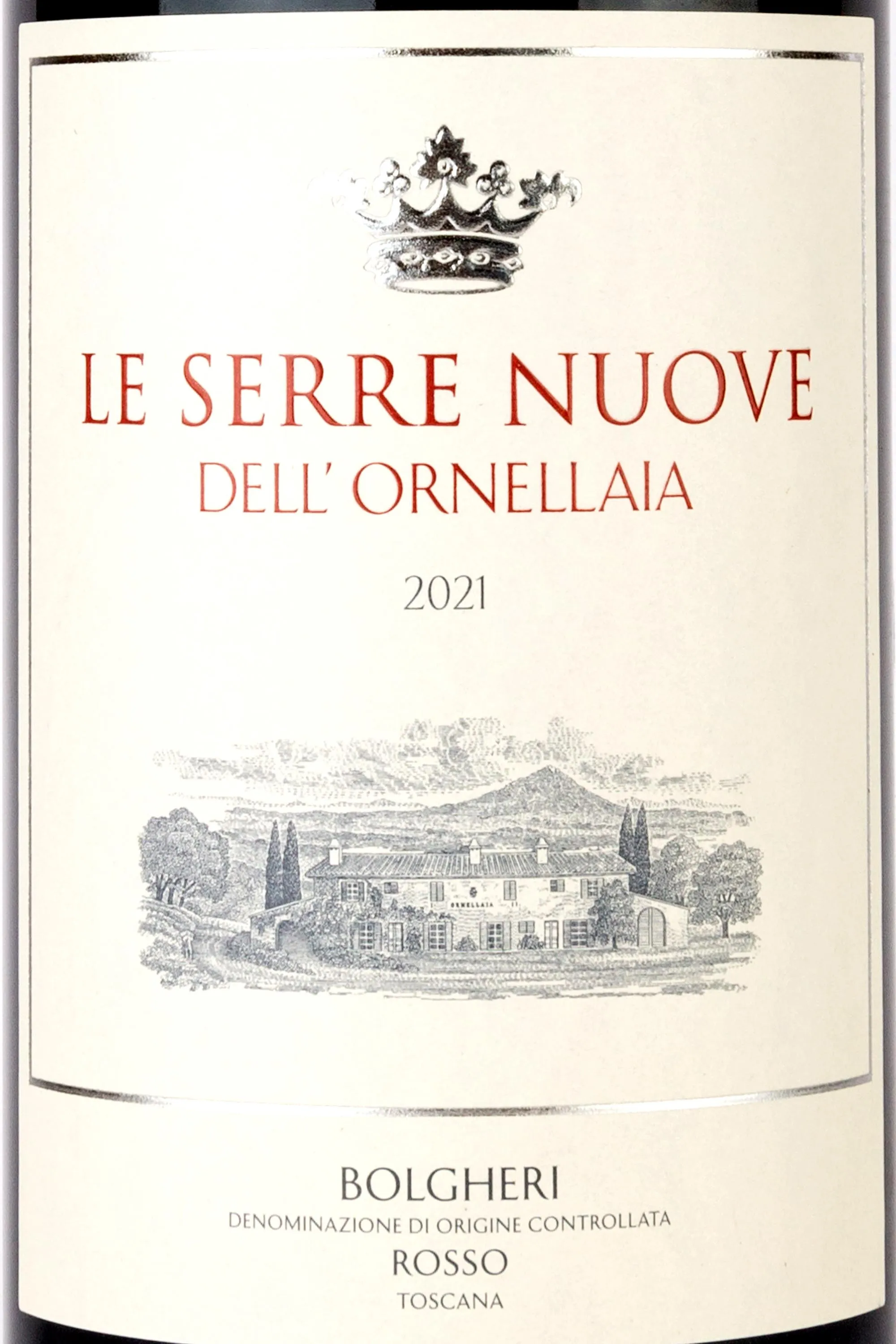 Вино Le Serre Nuove dell'Ornellaia 2021 г. 0.75 л — красное сухое итальянское вино из региона Тоскана. Сбор урожая осуществляется вручную. Ягоды проходят двойную сортировку, а затем мягкое прессование. Каждый сорт в течение недели проходит ферментацию индивидуально в ёмкостях из нержавеющей стали. Далее винтажное вино проходит мацерацию на мезге 10-15 дней. Яблочно-молочная ферментация начинается в стальных резервуарах, а заканчивается в дубовых бочках. Выдержка в бочках длится 12 месяцев. После этого вино купажируют и выдерживают 3 месяца. После бутилирования алкоголь дозревает в бутылках на протяжении 6 месяцев.
