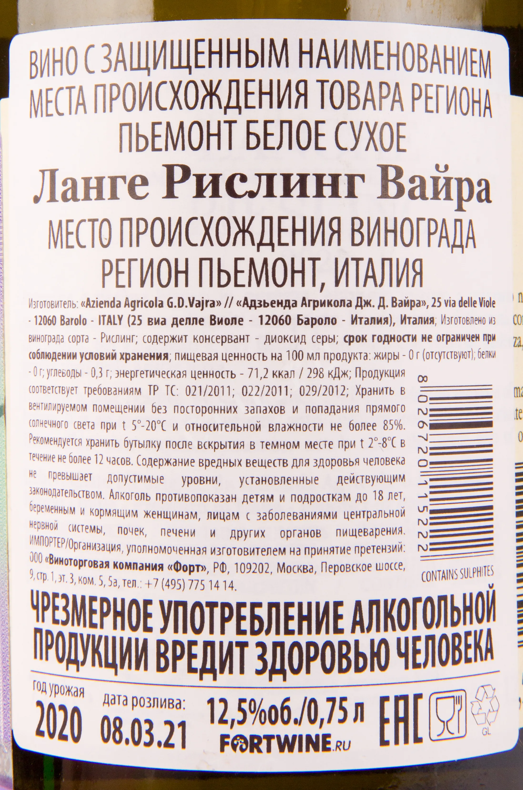 Белое сухое вино Petracine Riesling G.D. Vajra 2020 год 0,75 л — моносепажный алкоголь известного итальянского бренда, принадлежащего уважаемому семейному хозяйству. Основой напитка с минимальной сахаристостью стал стопроцентный виноград Рислинг, выращенный на почвах Пьемонта на высоте от 420 до 480 метров над уровнем моря. Участки обладают выгодной юго-восточной и восточной экспозицией. Урожай спелых ягод, собранных вручную, отсортировали и сразу же отправили на винодельню для сохранения свежести сырья. Его подвергли мягкому отжиму и низкотемпературной ферментации сроком двадцать суток, а также вызреванию в стальных чанах до весны следующего года.