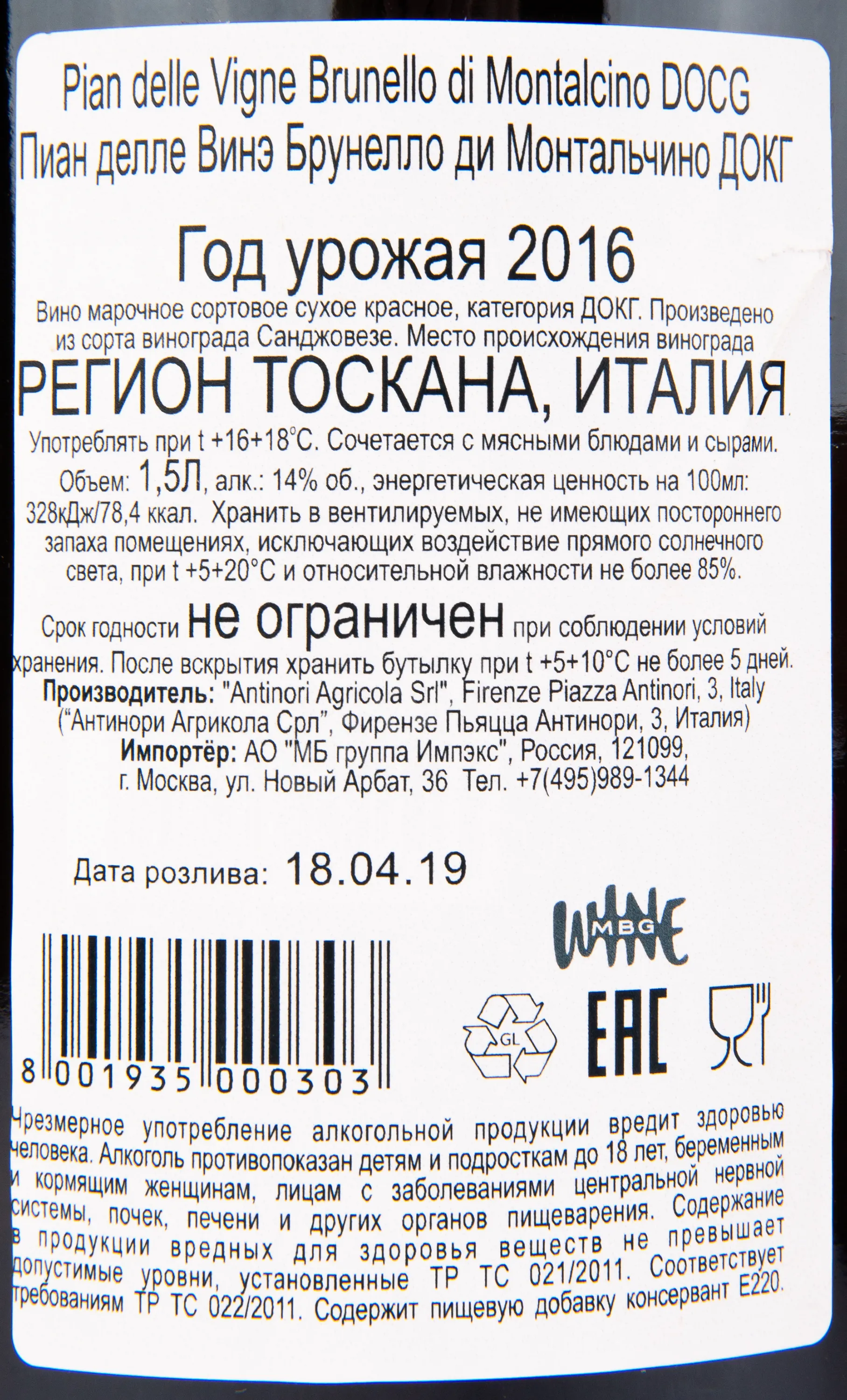 Антинори Пиан делле Винэ Брунелло ди Монтальчино 2016 1.5