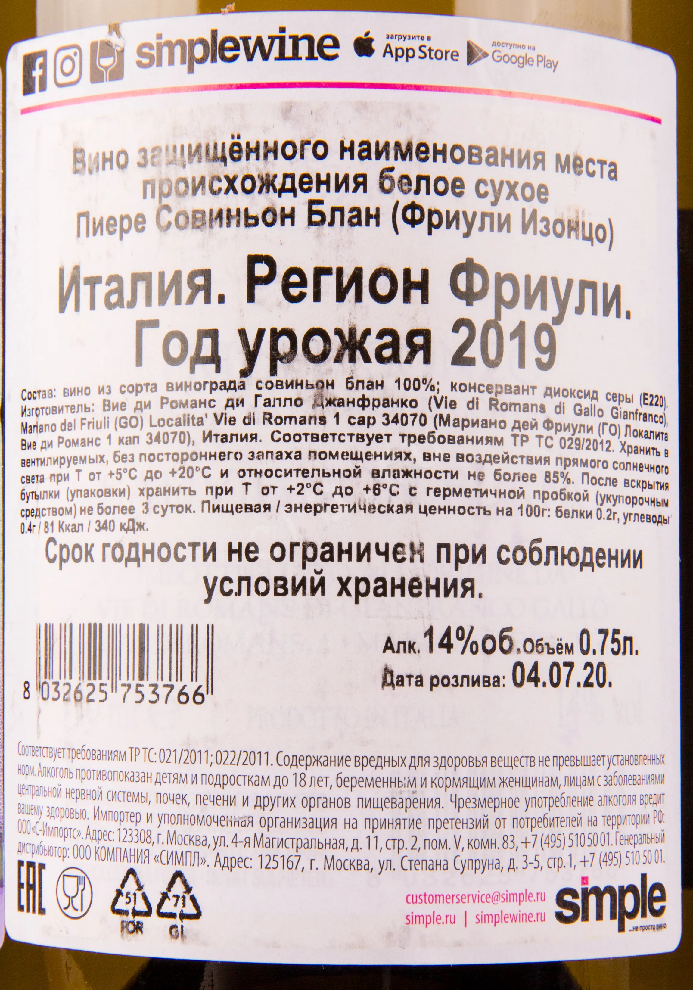 Вино Vie di Romans Piere Sauvignon DOC 2019 0.75 l – это освежающий итальянский алкоголь, контролируемый по месту происхождения. Моносортовой напиток создан из урожая одного года, собранного ручным способом. Сначала ягоды настаивают на кожице в стальных резервуарах, а после сусло сбраживают. Перед продажей белое сухое вино хранится сначала 7 месяцев в дубовых тарах, а после еще 11 месяцев непосредственно в бутылках. Напиток был разлит по стеклянным сосудам в июле 2020 года и рекомендуется к потреблению до 2025 года.