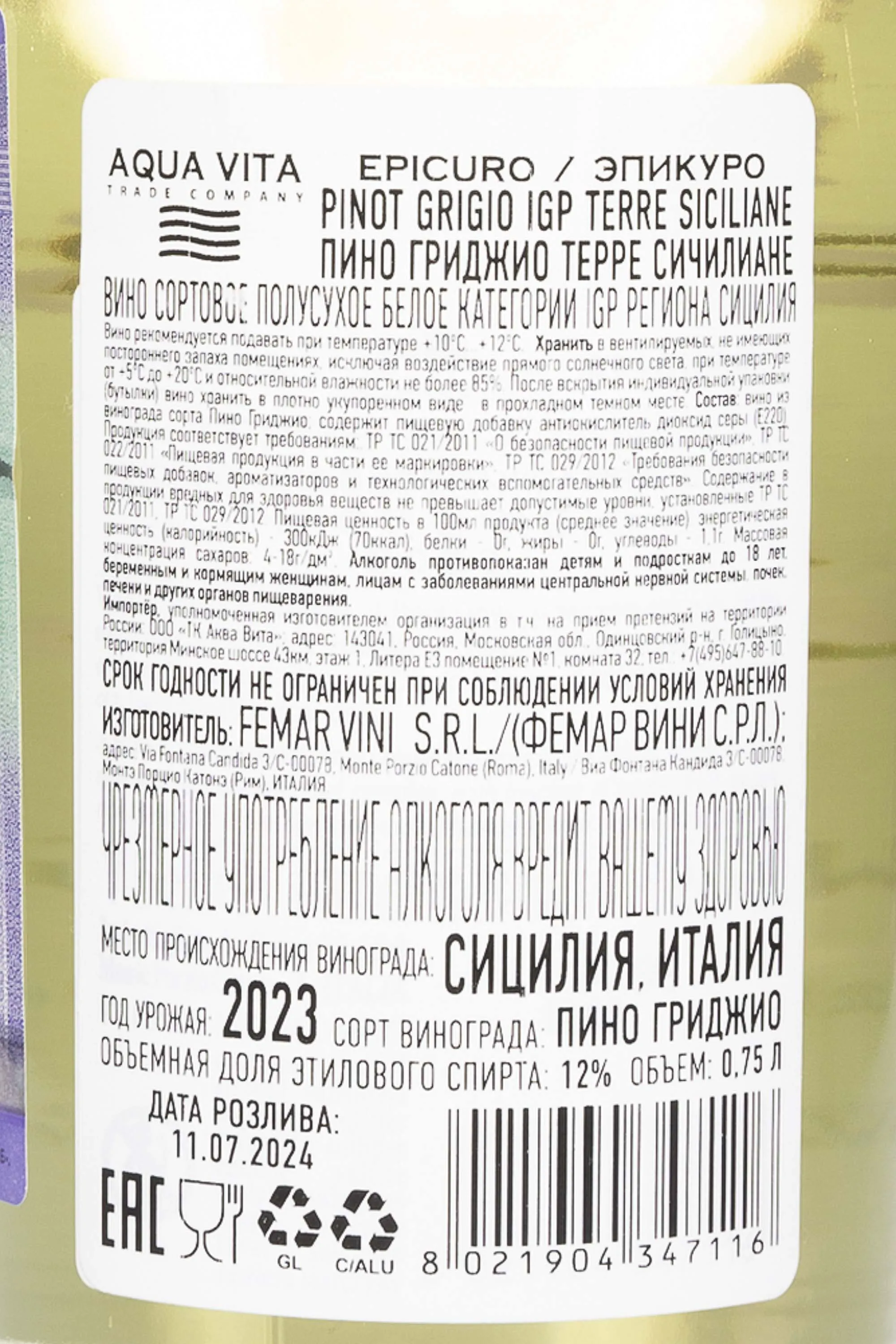 Изготовитель: Femar Vini S.R.L.