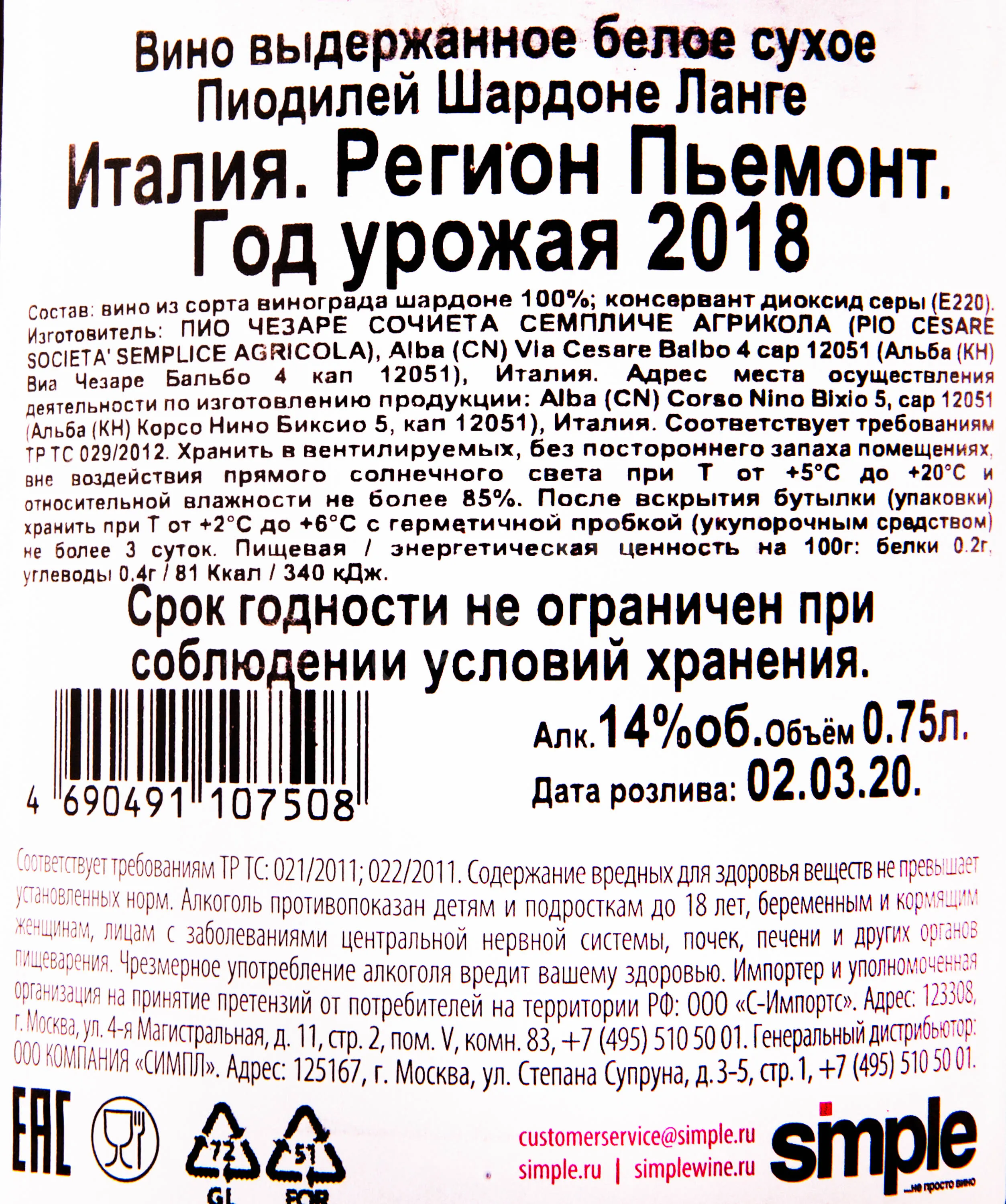 Pio Cesare Piodilei Chardonnay Langhe DOC 2018 0.75 л купить - Итальянское вино Пиодилей Шардоне Ланге цена в магазине г. Москва, ул. Профсоюзная, д. 16/10 10:00-22:00 Ежедневно +7 (495) 920-20-02 info@cru.ru