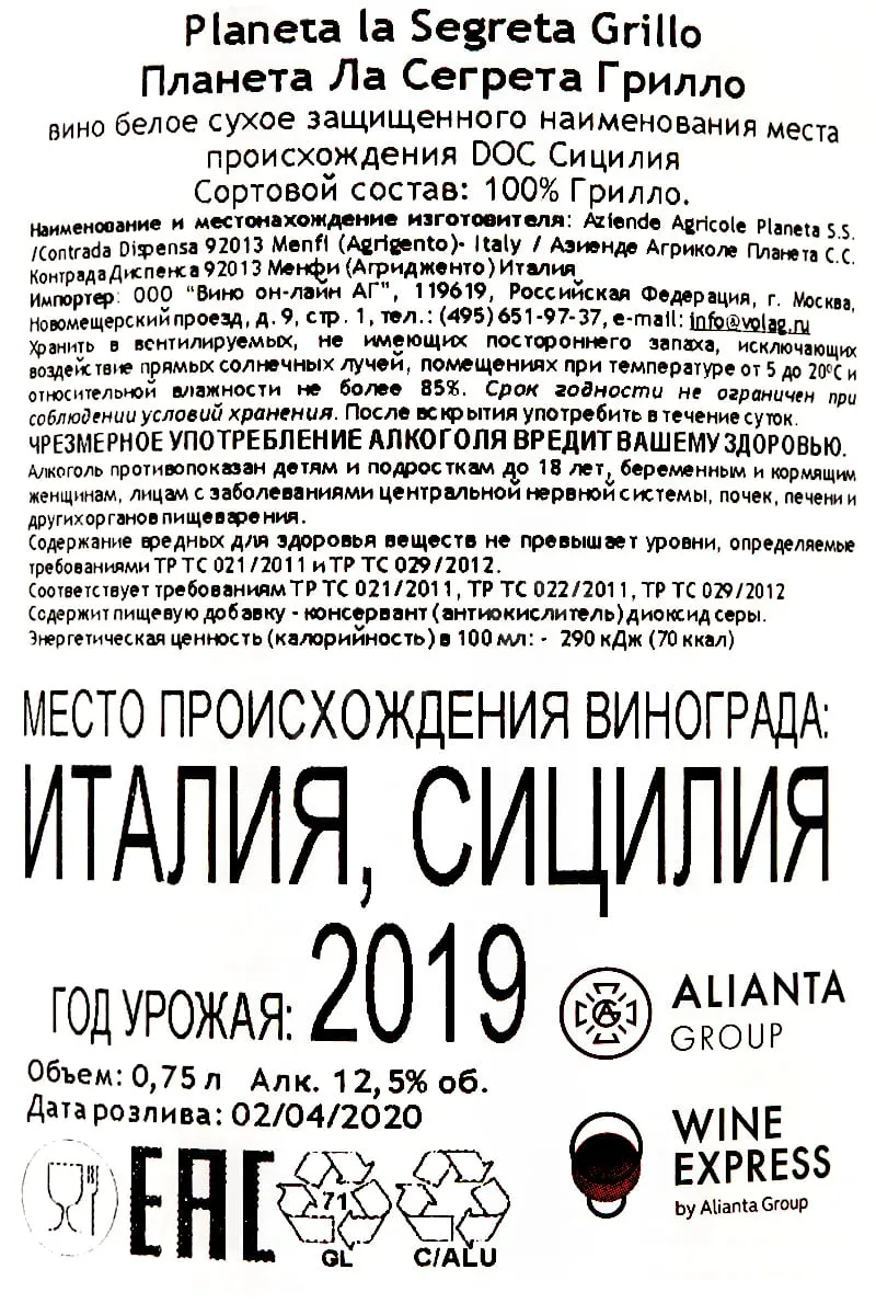 Planeta La Segreta Grillo 2019 0.75 л купить - Итальянское вино Планета Ла Сегрета Грилло цена в магазине г. Москва, ул. Профсоюзная, д. 16/10 10:00-22:00 Ежедневно +7 (495) 920-20-02 info@cru.ru