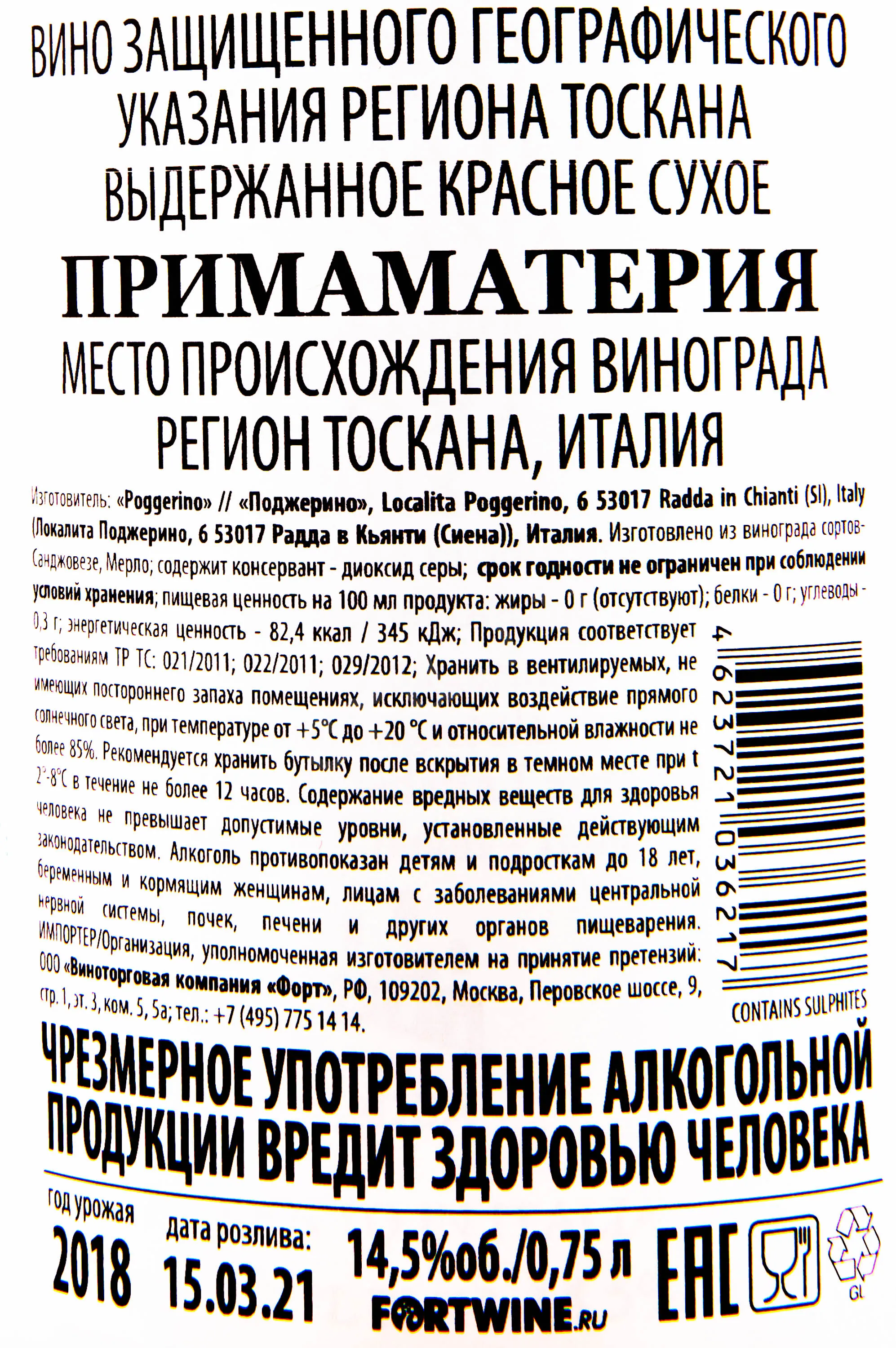 Poggerino Primamateria Toscana IGT 2019 0.75 л купить - Итальянское вино Примаматерия Поджерино цена в магазине г. Москва, ул. Профсоюзная, д. 16/10 10:00-22:00 Ежедневно +7 (495) 920-20-02 info@cru.ru