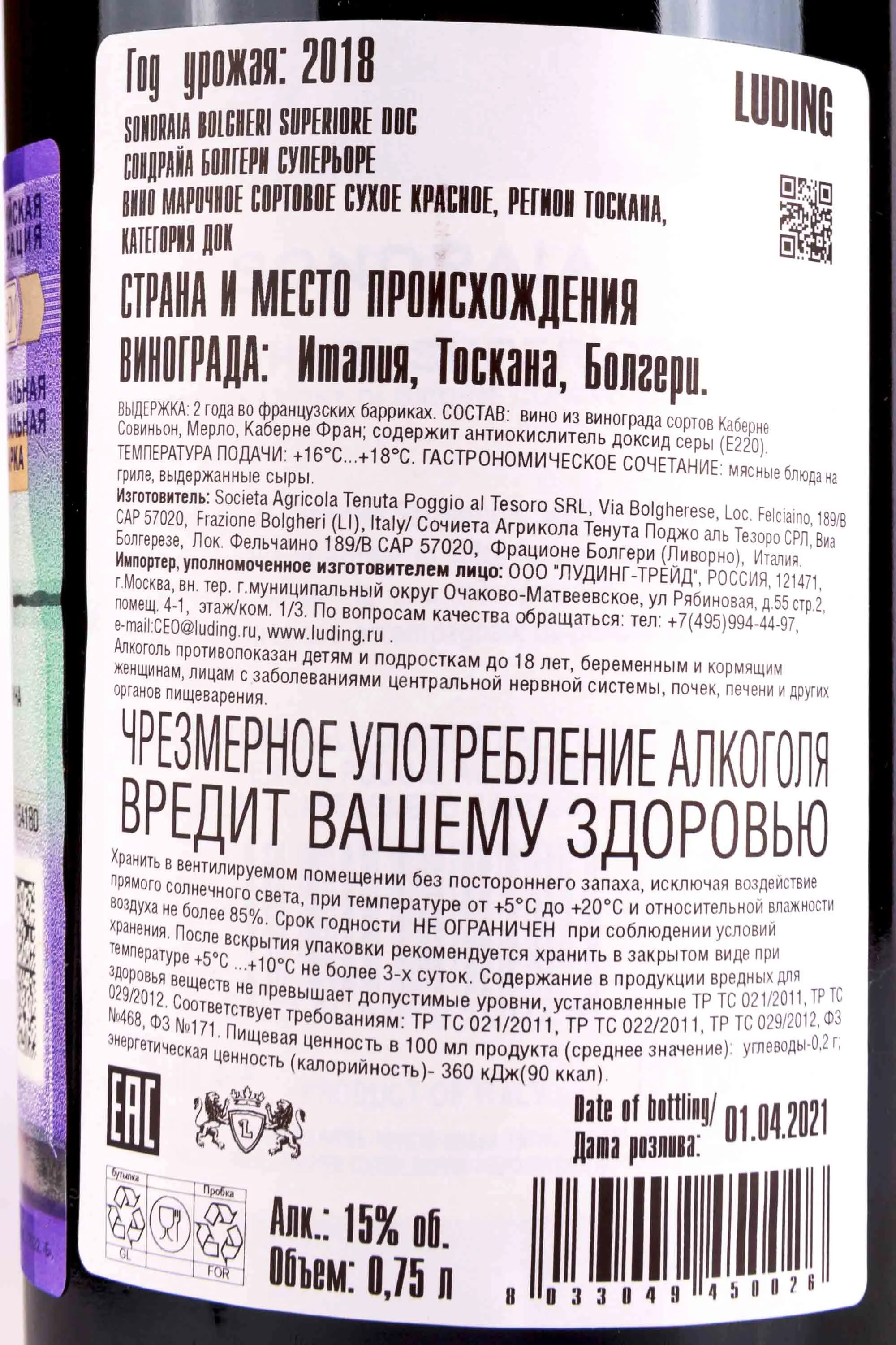 Вино Poggio Al Tesoro Sondraia Bolgheri Superiore 2018 — флагманское кюве хозяйства Poggio al Tesoro, основанного семьёй Аллегрини в Болгери. Урожай собирали с двух ключевых участков: Via Bolgherese с гравийно-песчаными почвами и отличным дренажем, где выращивали Каберне Совиньон, и Le Sondraie с глинистыми почвами, богатыми железом и магнием, дававшими Мерло и Каберне Фран. Лозы средней возрастной категории обеспечивали баланс концентрации и свежести. Ферментация проходила с контролем температуры, после чего ассамбляж (65% Каберне Совиньон, 25% Мерло, 10% Каберне Фран) выдерживали 22 месяца в французских барриках (70% новых), что сформировало структуру и глубину. Винтаж 2018 года, несмотря на сложные условия, был признан очень удачным, подчеркнув элегантный стиль Болгери с акцентом на гармонию, а не избыточную мощь.