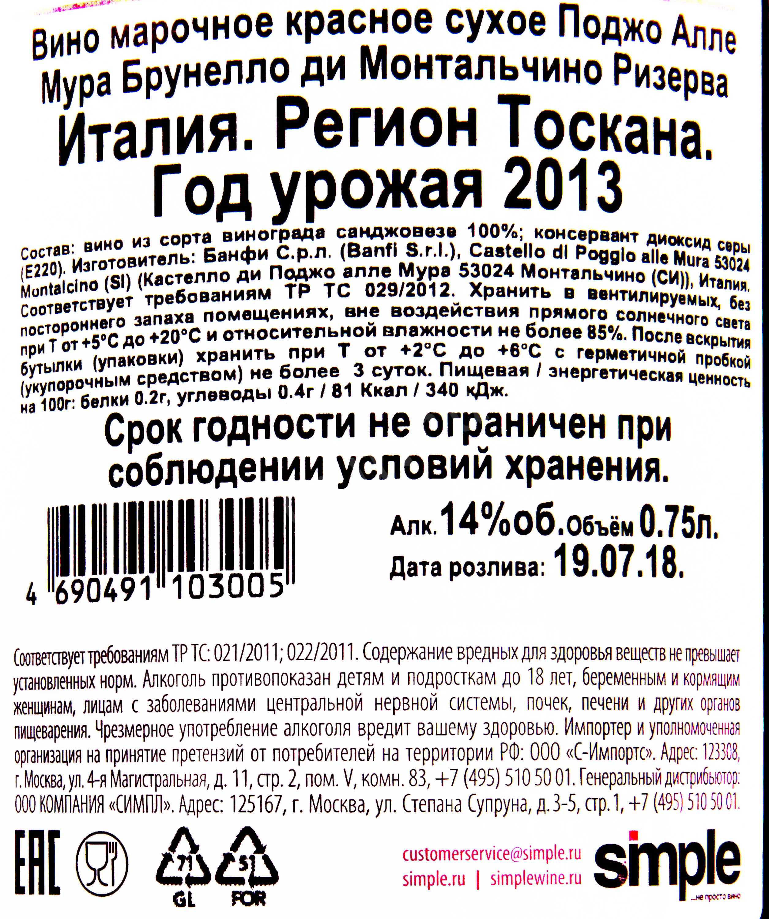Поджо Алле Мура Брунелло ди Монтальчино 2013 0.75