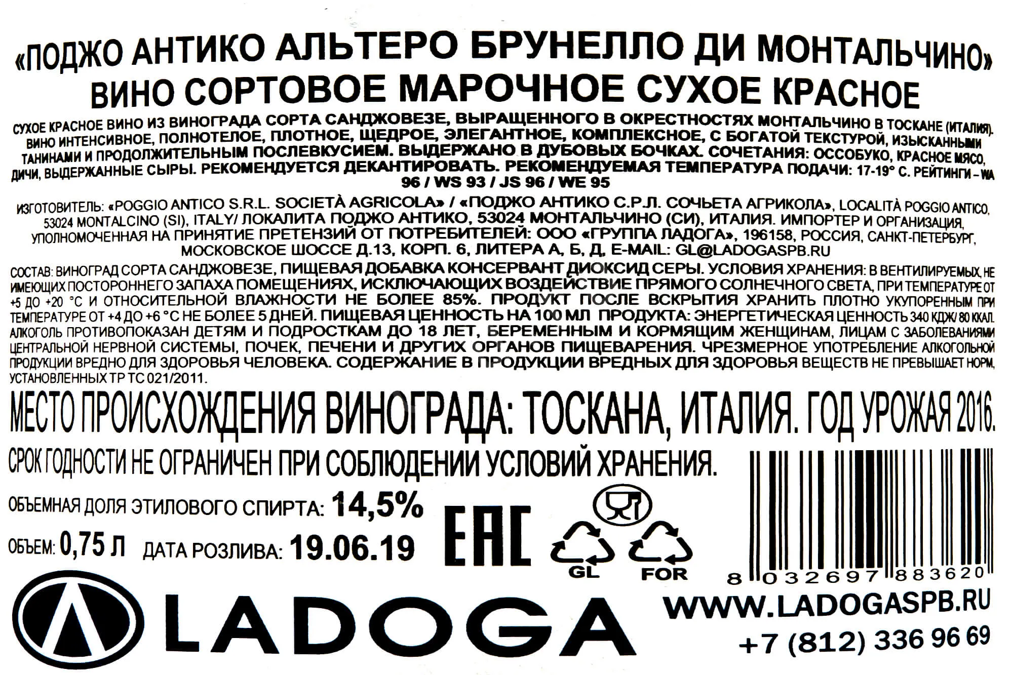 Поджо Антико Альтеро Брунелло ди Монтальчино Резерва 2016 0.75