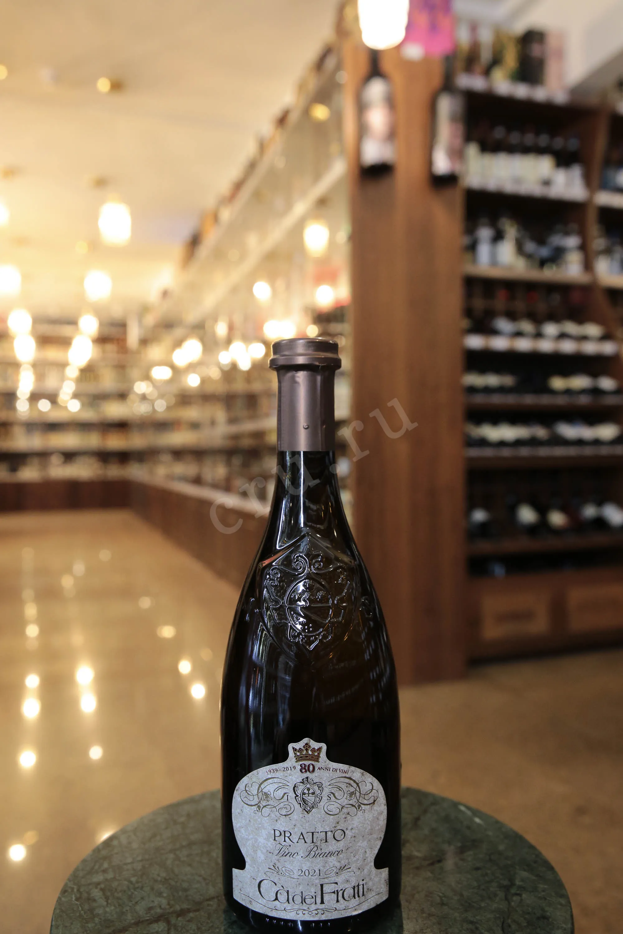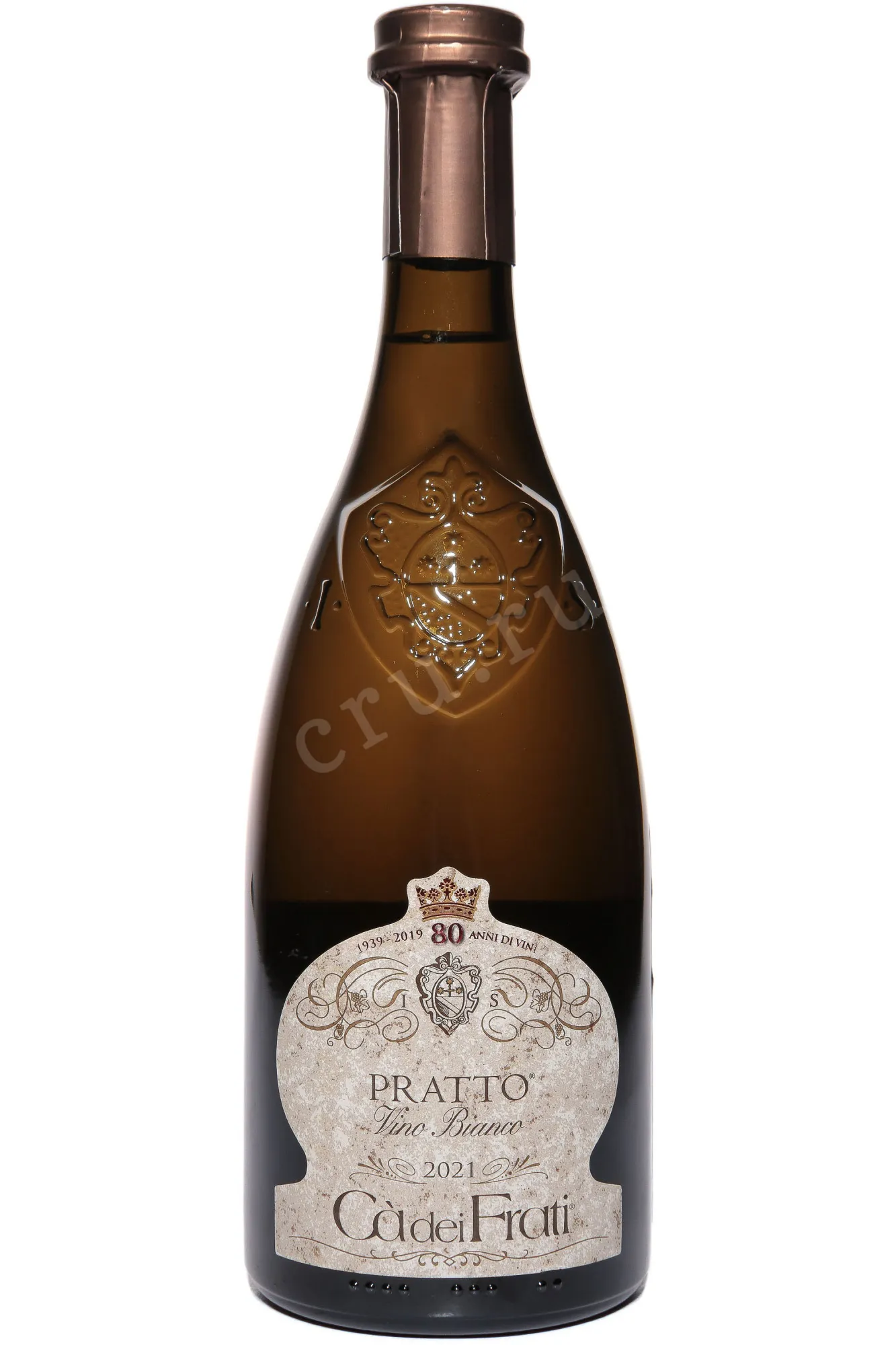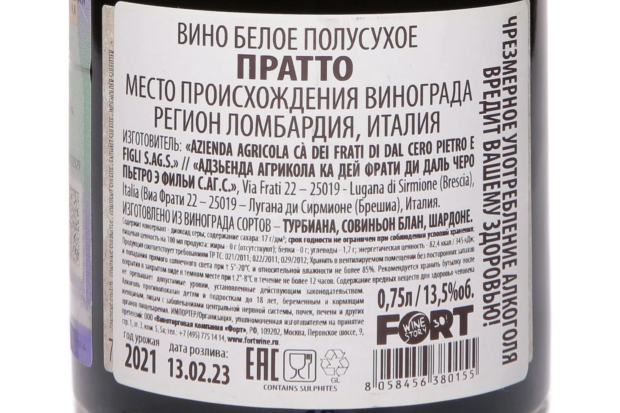 Белое полусухое вино Ca` dei Frati Pratto 2019 г. представляет собой купаж трех сортов винограда — автохтонных и международных, выращенных на плантациях итальянской Ломбардии. Сырье было собрано в один сезон урожая на богатых глиной и известняком участках и подвергнуто ферментации в стальных и дубовых чанах. Выдержка сроком 12 месяцев осуществилась в дубе. Вино крепостью 14% обладает средней сахаристостью (16,5 г/л).