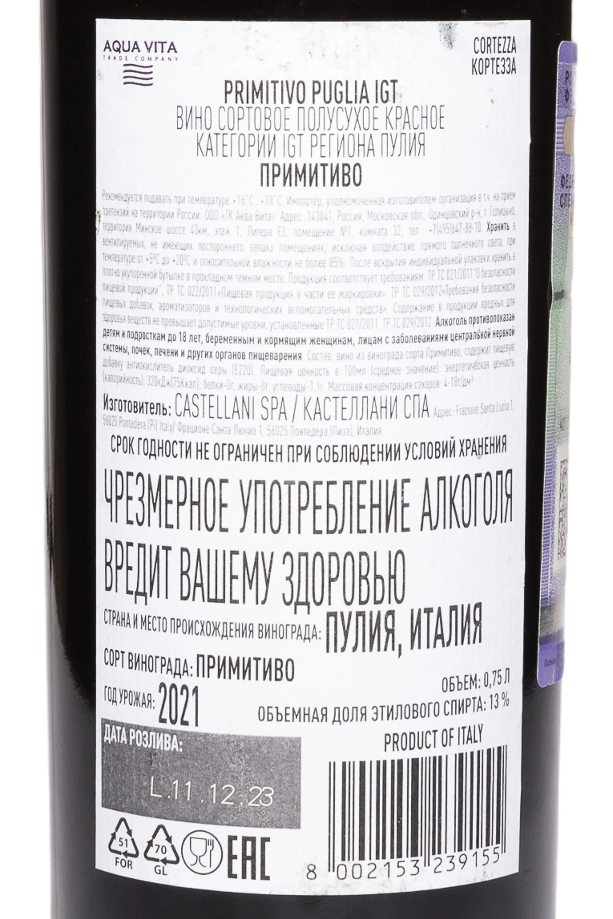 Primitivo Cortezza IGТ 2021 0.75 л купить - Итальянское вино Примитиво Кортезза цена в магазине г. Москва, ул. Профсоюзная, д. 16/10 10:00-22:00 Ежедневно +7 (495) 920-20-02 info@cru.ru