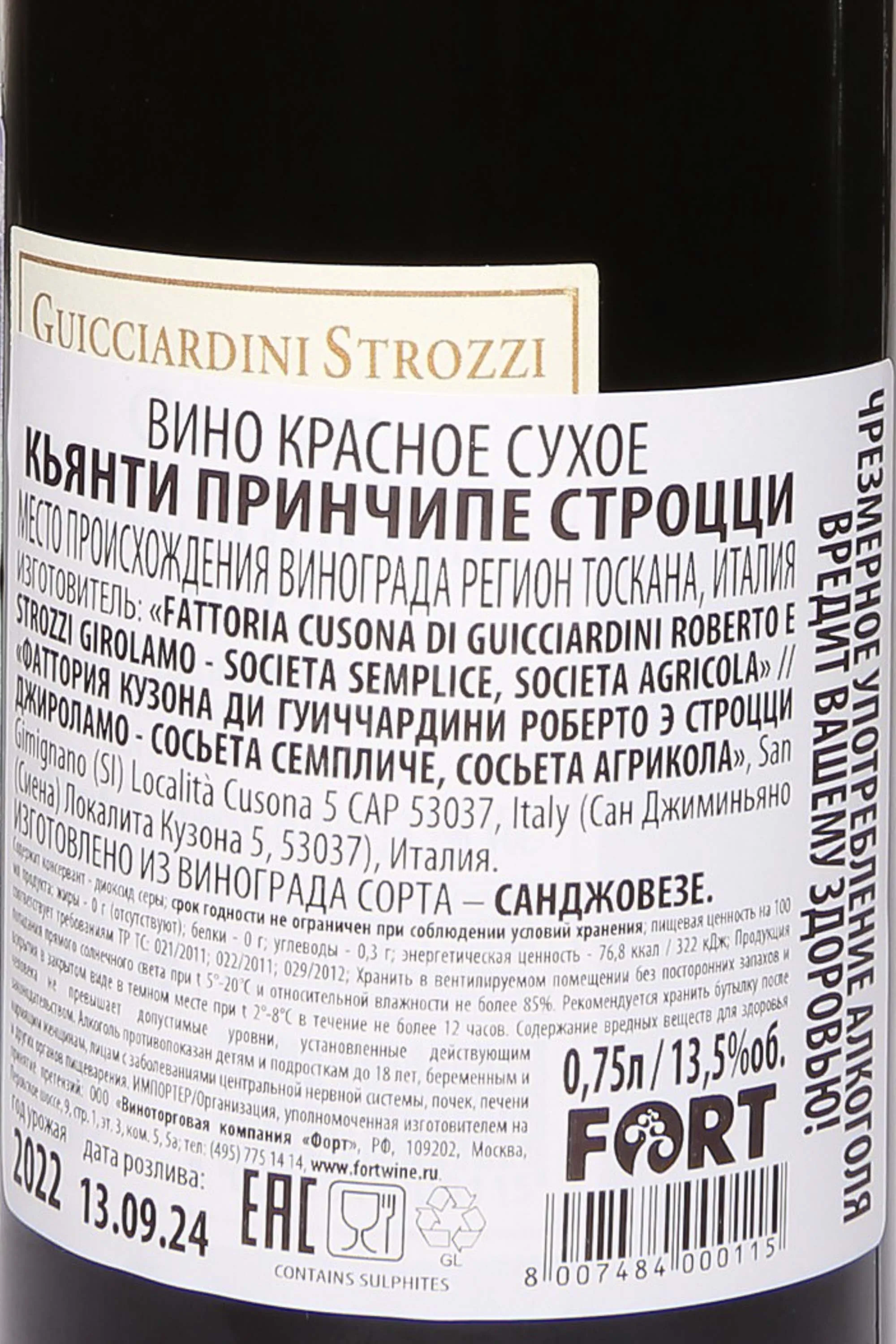 Красное сухое вино Principe Strozzi Chianti DOCG 2022 год 0,75 из знаменитой тосканской зоны Кьянти содержит местный сорт Sangiovese, который бережно собрали в ручную и практически сразу загрузили их в винификаторы . Ферментация подготовленного сусла, прошедшего долгую мацерацию при невысоких температурных показателях, была выполнена в соответствии с классической методикой. После этого вино длительное время вызревало в дубовых бочках большого размера.