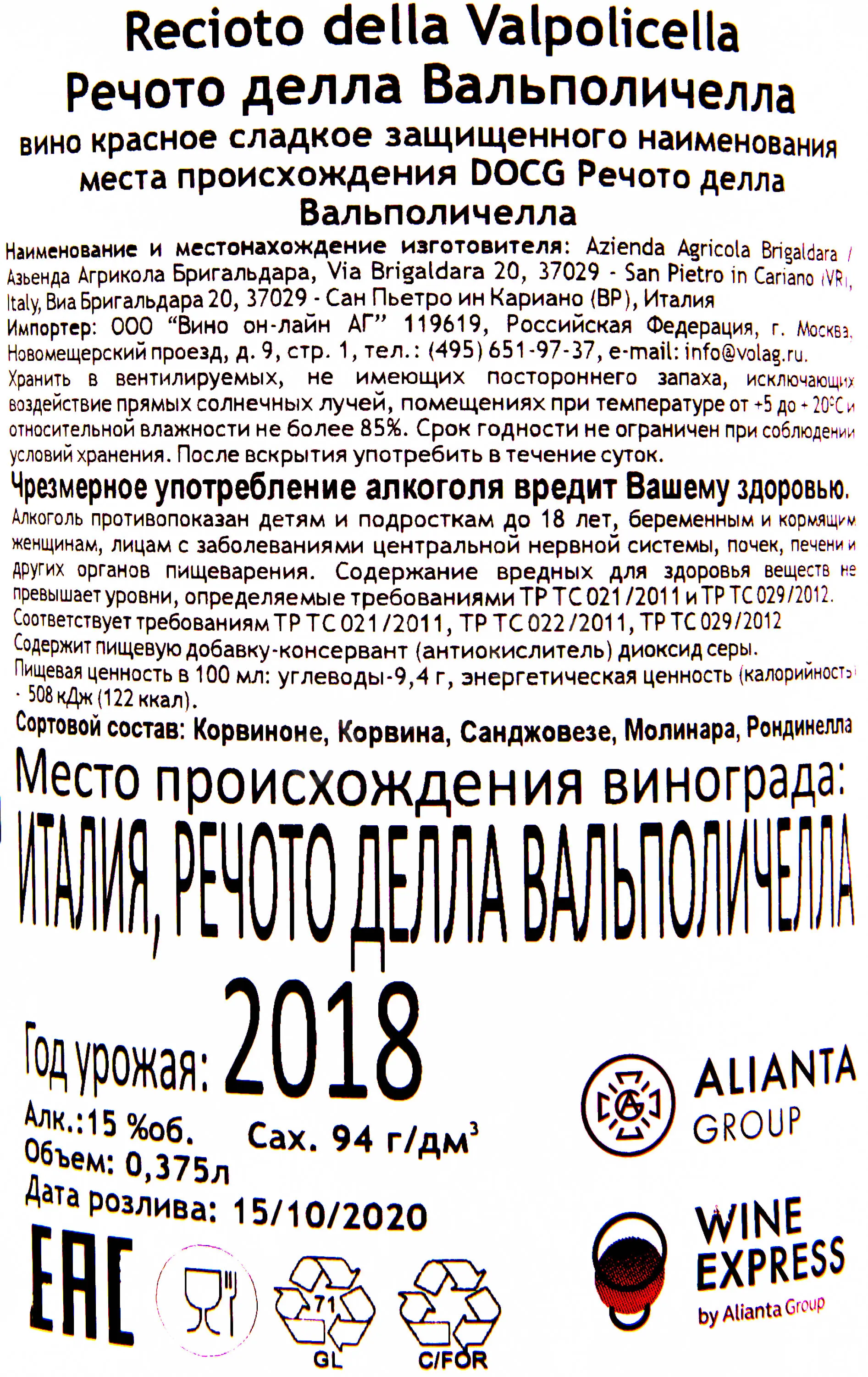 Красное сладкое вино Recioto della Valpolicella Brigaldara 2018 г. 0,375 л производится в Италии из нескольких сортов винограда только в лучшие урожайные годы. 2018 год отличается долгим вегетационным циклом, при котором вызревание винограда происходило медленно. Удалось получить обильный урожай высокого качества. Сбор плодов проводился в последней половине октября с лоз возрастом более 20 лет. На винодельне ягоды подверглись сушке в вентилируемом помещении методом «appassimento». Ферментация заизюмленного таким способом винограда продолжалась до тех пор, пока не был достигнут баланс крепости и сахара. Созревает вино в бочках из дубовой древесины объемом не менее 25 гл на протяжении 24 месяцев. Напиток предлагается к продаже в бутылке мини-формата объемом 375 мл. Потенциал его хранения составляет 5-10 лет.