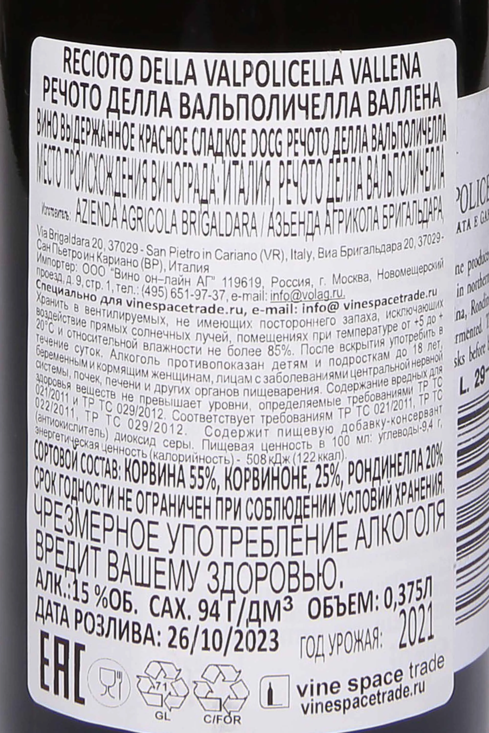 Красное сладкое вино Brigaldara Recioto della Valpolicella Vallena 2021 г. 0,375 л создано в одном из старейших винодельческих регионов Венето, в зоне Вальполичелла. Это традиционный купаж, который получают методом аппассименто: ягоды собирают вручную и сушат на решетках в течение нескольких месяцев, пока они не потеряют значительную часть влаги и не сконцентрируют сахара. Сезон 2021 года отличался умеренными температурами весной и сухим летом с редкими дождями, что позволило ягодам набрать оптимальный баланс кислотности и сладости. Плоды собрали с лоз, растущих на известняковых и глинисто-аллювиальных почвах на склонах холмов, где виноград получает достаточно солнца и хорошую вентиляцию. Бленд изготовлен небольшим тиражом, что подчеркивает его характер и делает особенно ценным.