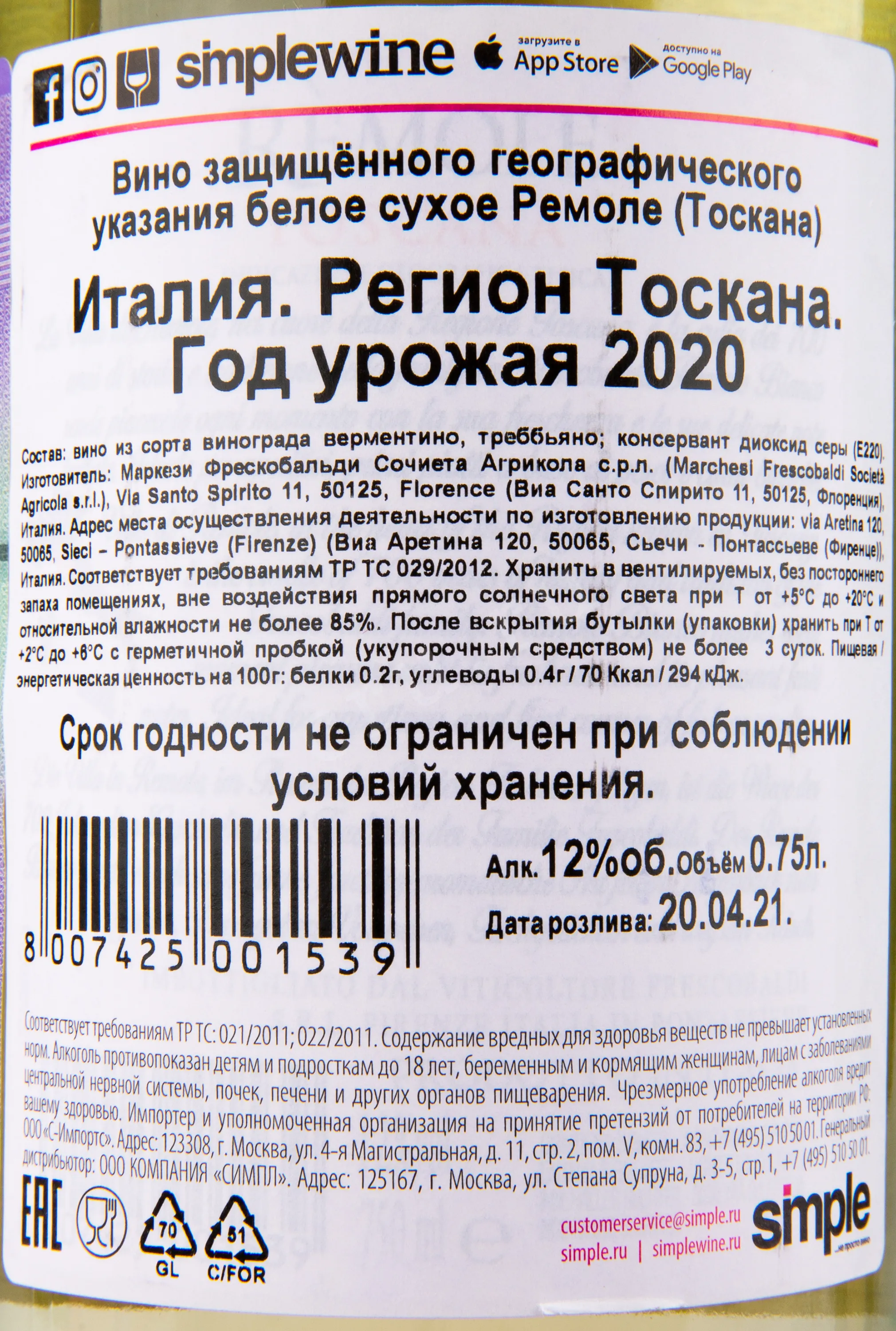 Вино Remole Toscana 0.75 л - белое сухое итальянское вино. Сбор урожая осуществляется вручную. Ферментация проходит в стальных ёмкостях. Вино из Тосканы выдерживается на осадке в нейтральных ёмкостях 4 месяца.