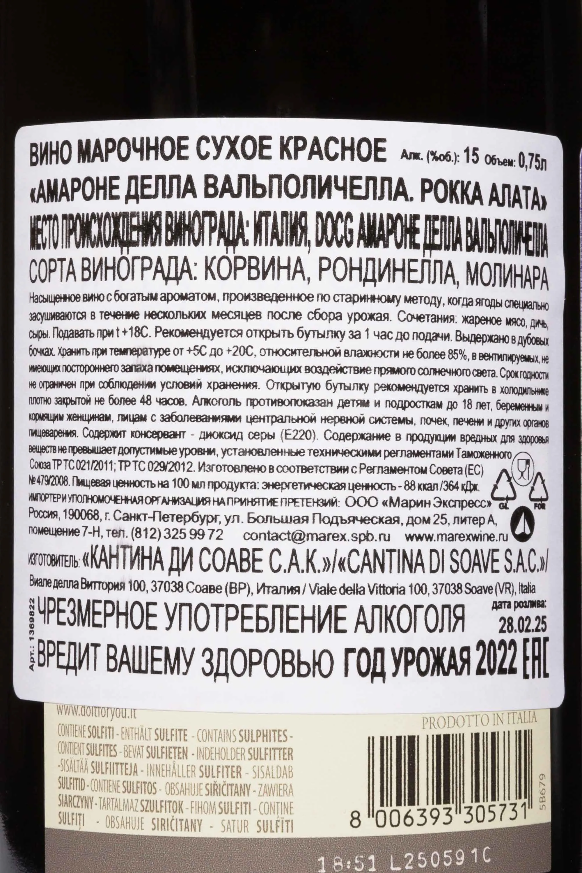 Вино Rocca Alata Amarone della Valpolicella 0,75 л – красное сухое из Италии с выдающимися органолептическими характеристиками, созданное на основе купажа трех темных сортов винограда. Уборку урожая проводят с конца сентября по начало октября, помещая грозди в деревянные ящики. Винификацию осуществляют не сразу, а спустя несколько месяцев, вплоть до конца января будущего года. В это время ягоды подвяливают в хорошо вентилируемых помещениях с целью достичь максимальной концентрации вкуса и аромата. Усушенный на 30-40% от первоначального веса виноград бережно отжимают и ферментируют на кожице при температурном контроле. Затем сусло снимают с осадка и подвергают малолактическому брожению в резервуарах из стали. Выдерживают вино в больших дубовых ботти (бочки 400 и более литров округлой или цилиндрической формы). Потенциал его хранения 5-10 лет.