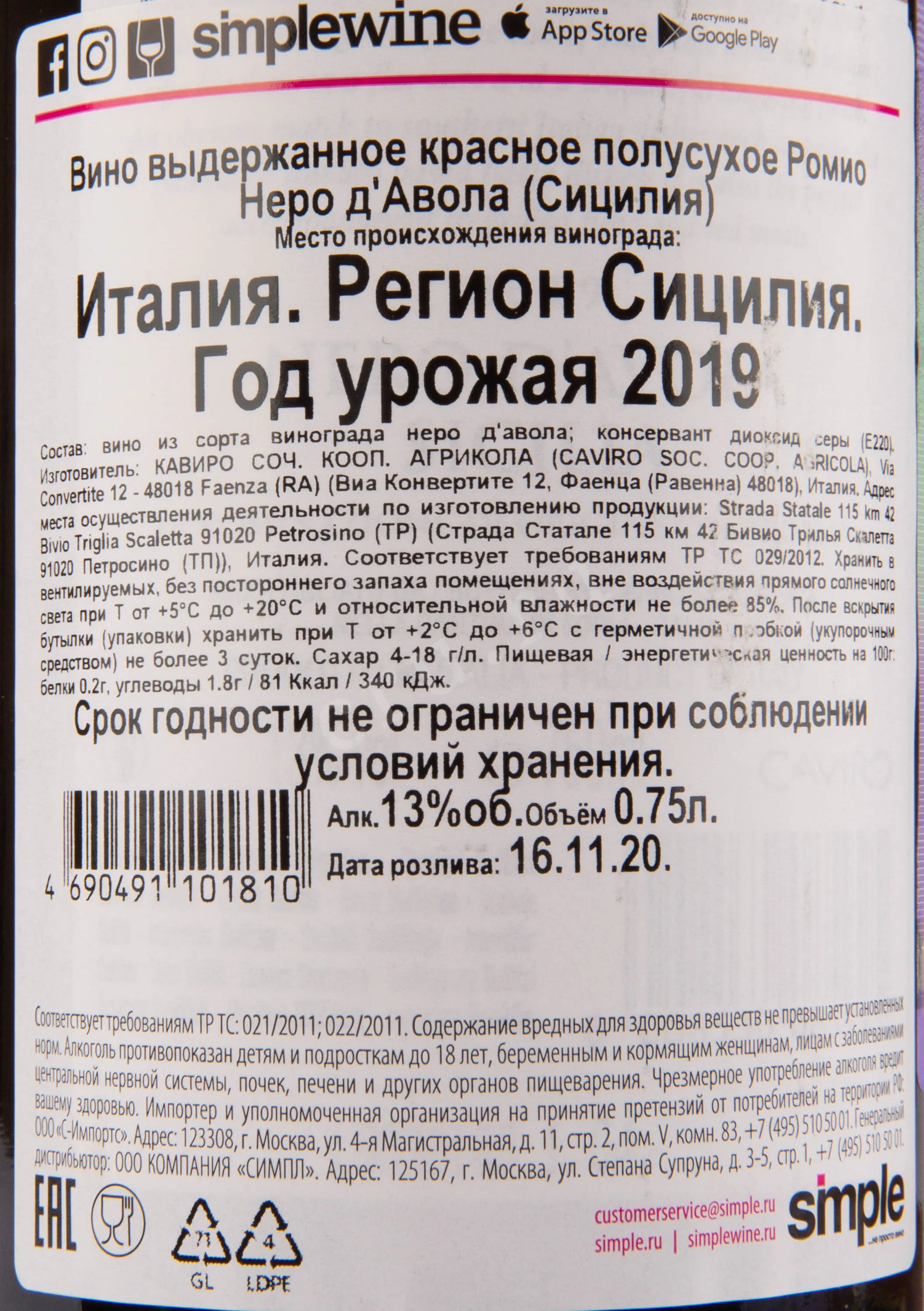 Красное полусухое вино Romio Nero d`Avola 2019 г. — 13-градусный итальянский напиток гарантированного качества, созданный из автохтонного сицилийского винограда, который выращивался в условиях средиземноморского климата. Его сорвали с лоз в летний сезон одного урожайного года, аккуратно отсортировали и подвергли мацерации и ферментации в стальных цистернах с применением термоконтроля. Вино, имеющее сахаристость от 4 до 18 г/л, лучше всего выпить в течение первых двух лет после розлива (он пришелся на ноябрь 2020 г.)
