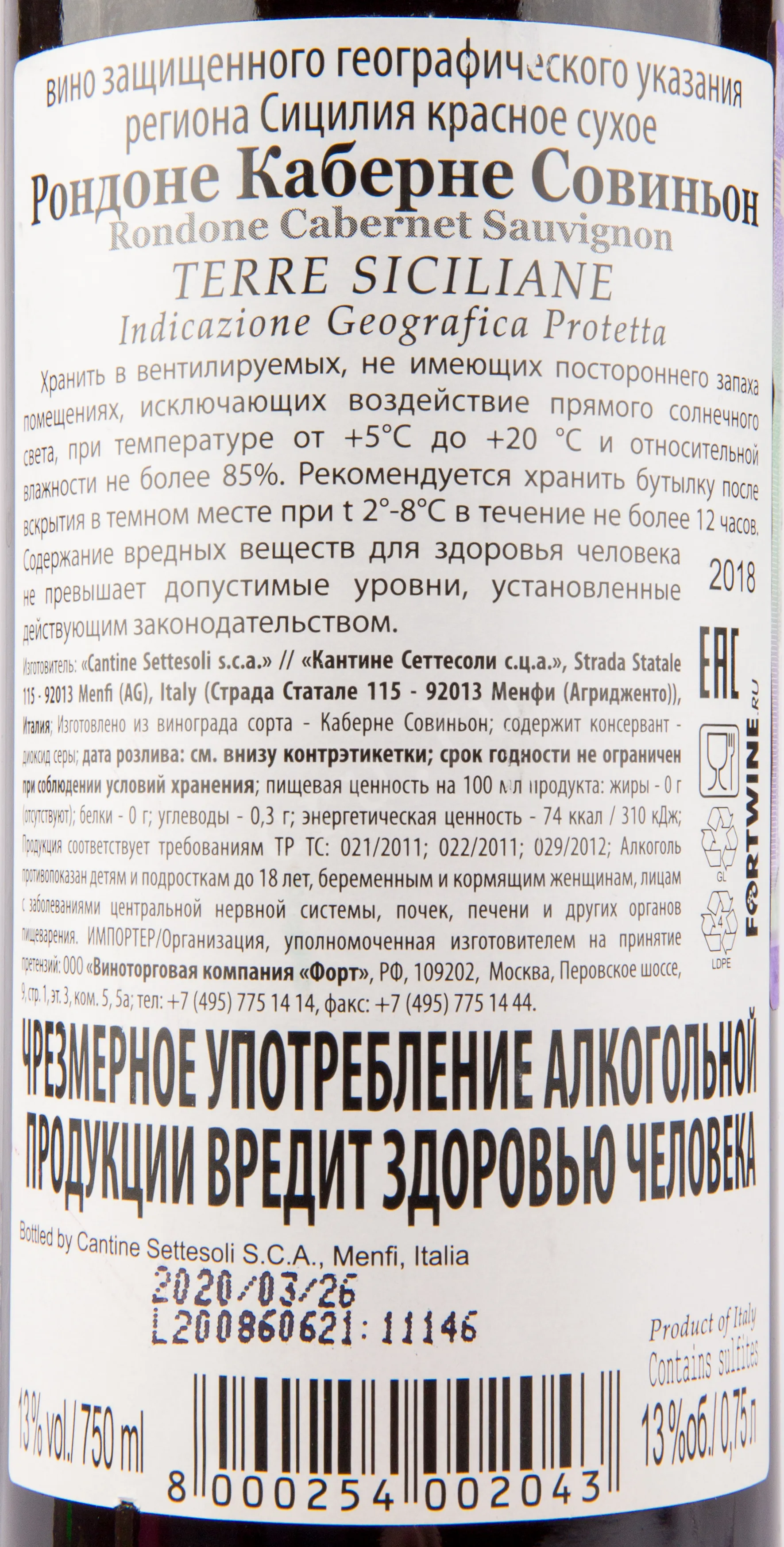 Rondone Cabernet Sauvignon 2018 0.75 л купить - Итальянское вино Рондоне Каберне Совиньон цена в магазине г. Москва, ул. Профсоюзная, д. 16/10 10:00-22:00 Ежедневно +7 (495) 920-20-02 info@cru.ru