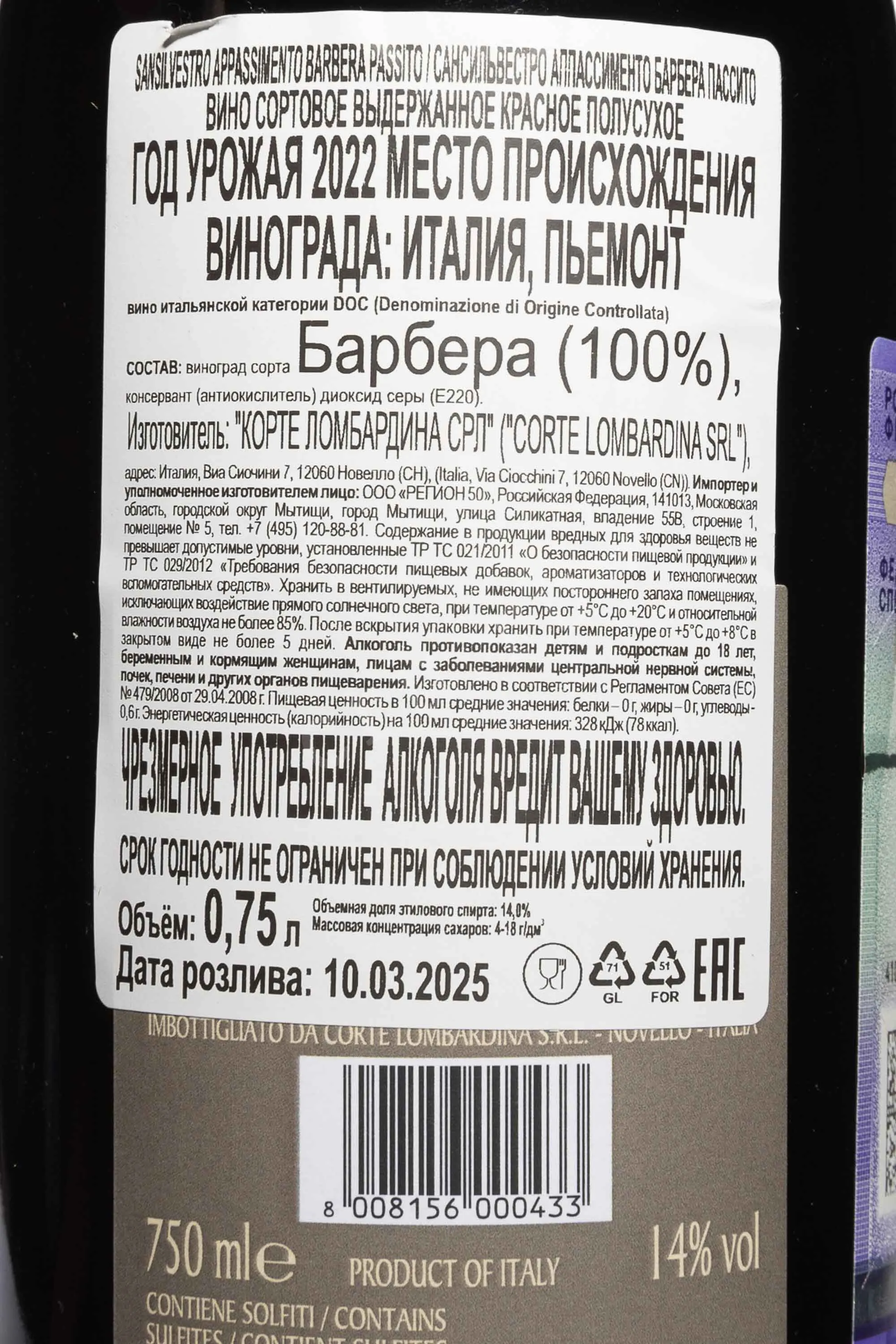 Красное полусухое вино San Silvestro Barbera Passito Appassimento Piemonte DOC 2022 года 0,75 л создано в современном стиле с акцентом на плотность вкуса и мягкую структуру. Виноград выращен в Пьемонте, где холмистый терруар и перепады температур формируют выразительную кислотность Барберы. Сезон 2022 года был тёплым и сухим, что обеспечило стабильное созревание ягод и высокое качество урожая. Производство основано на методе аппассименто: часть собранных вручную гроздей сушат на воздухе около сорока дней, другая часть подвяливается на лозах. Каждая партия проходит отдельную винификацию, мацерация длится десять дней с регулярной перекачкой сусла. После малолактической ферментации сусло объединяют и выдерживают около шести месяцев в небольших бочках. Это вино ценят за насыщенность, гармонию и стабильный потенциал выдержки, достигающий семи лет.
