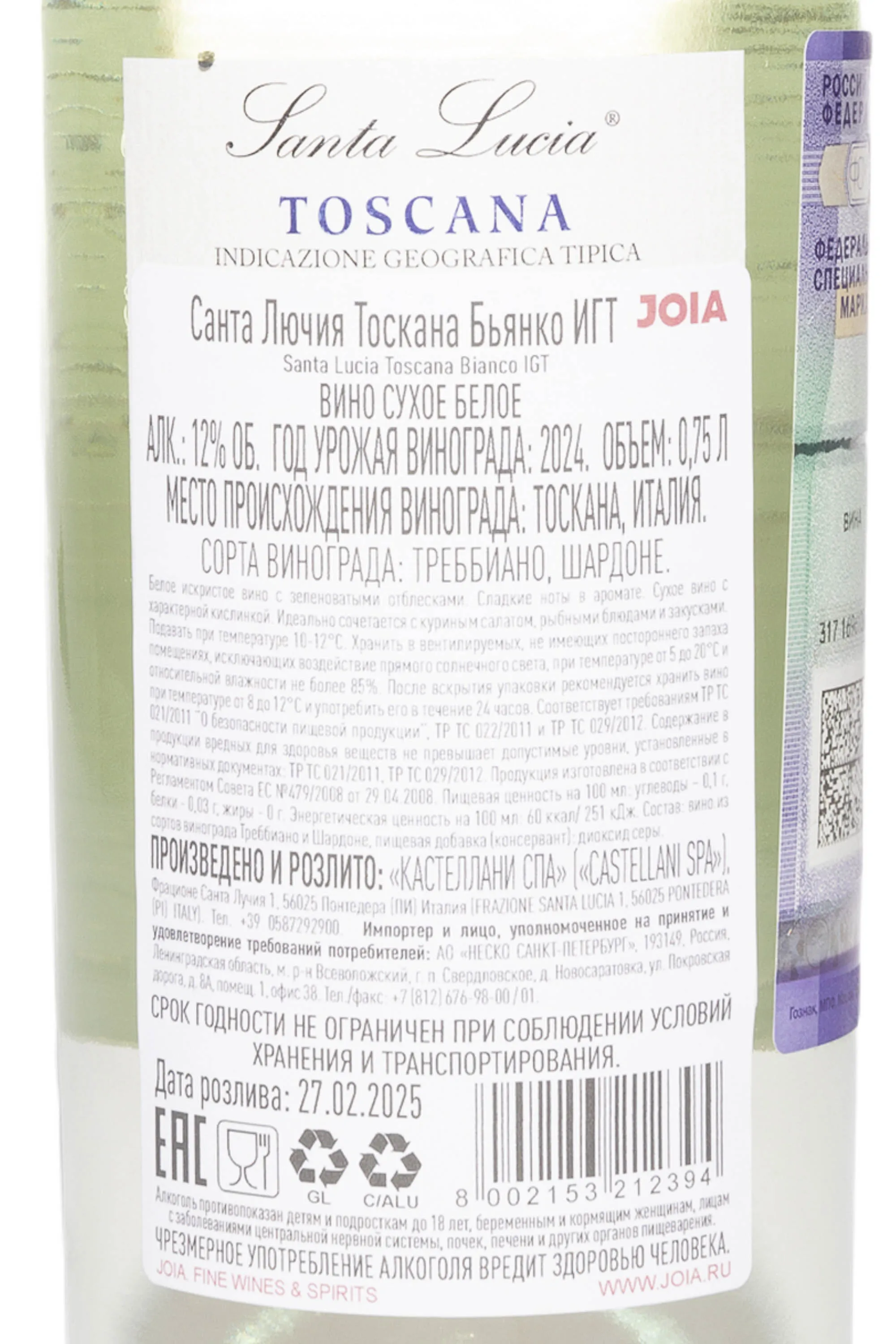 Белое сухое вино Santa Lucia Toscana Bianco IGT 2024 года 0,75 л создано в сердце Тосканы, где мягкий климат и известняковые почвы придают ягодам яркую кислотность и минеральность. 2024 год был благоприятным для виноградарей: весна выдалась прохладной и ровной, а лето — тёплым, но без изнуряющей жары. Это позволило ягодам созреть равномерно и сохранить свежесть. Ферментация проходила при контролируемой температуре в нержавеющих емкостях, что помогло сохранить ароматическую чистоту и натуральную структуру вина. Выдержка на тонком осадке придала напитку объём и мягкость. Вино отличается гармонией вкуса и типичной тосканской элегантностью, отмечено положительными отзывами сомелье за сбалансированность и свежесть.